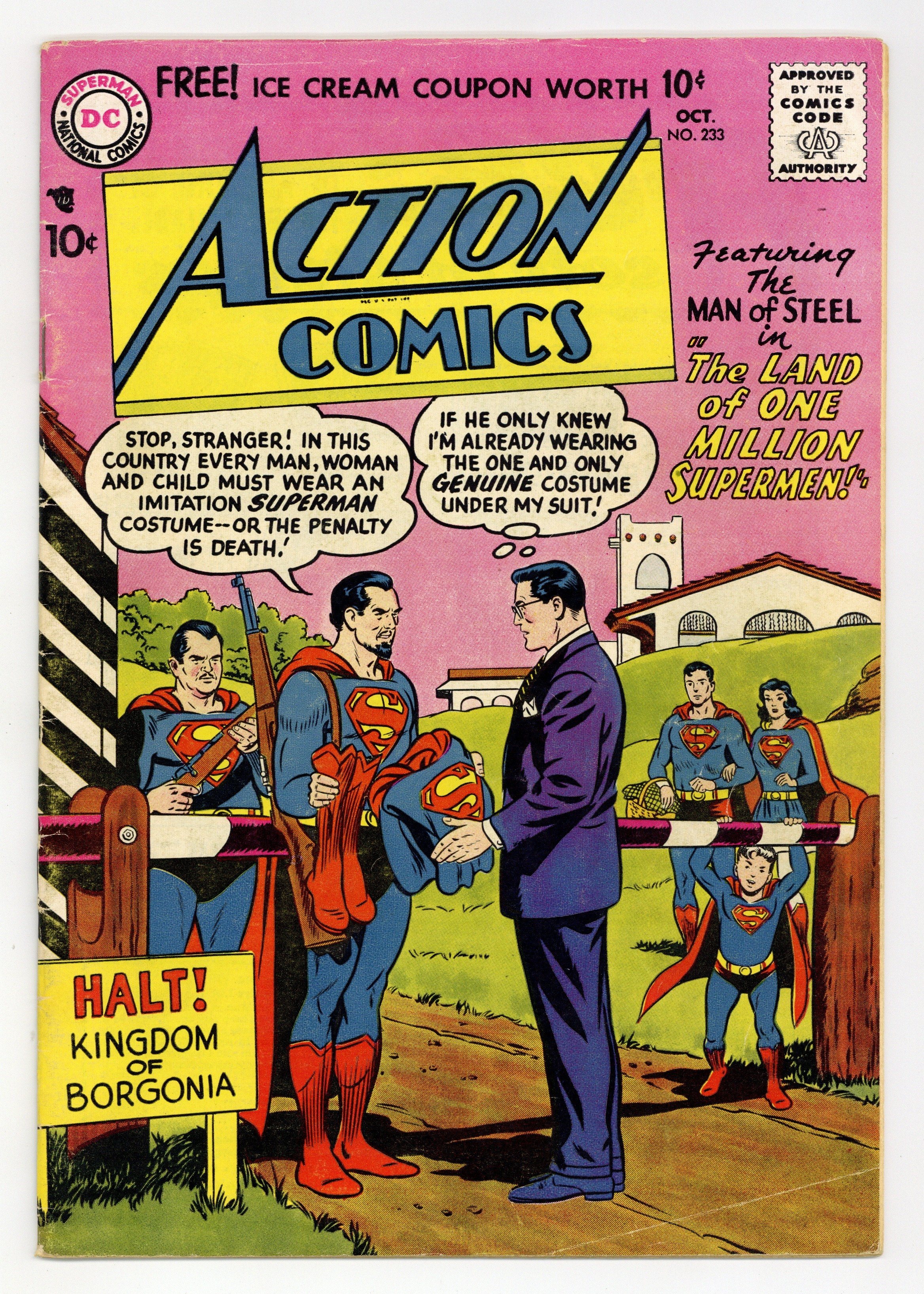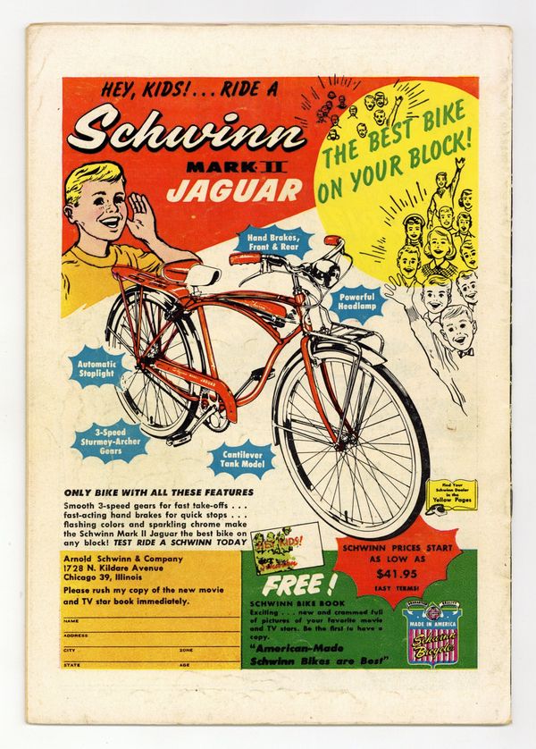 Cover pencils by Curt Swan, inks by Stan Kaye. "The Land of A Million Supermen," script by Jerry Coleman, pencils by Wayne Boring, inks by Stan Kaye; When Clark Kent is accidentally stranded in the nation of Borgonia, he discovers that everyone there, including himself, must wear a Superman costume on pain of death... which is a giant trap the dictator of Borgonia has set for the real Superman. "The Jungle Eskimo" starring Congo Bill, art by Howard Sherman. So, You Want to Be an Engineer text story. "The Forbidden Robots," script by Otto Binder, art by Jim Mooney; Tommy and Brent stop the transport of smuggled forbidden robots. 36 Pages, Full Color. $.10 Cover price $0.10. Grade: VG+ 4.5 explanation of grade Condition: Used (collectible)