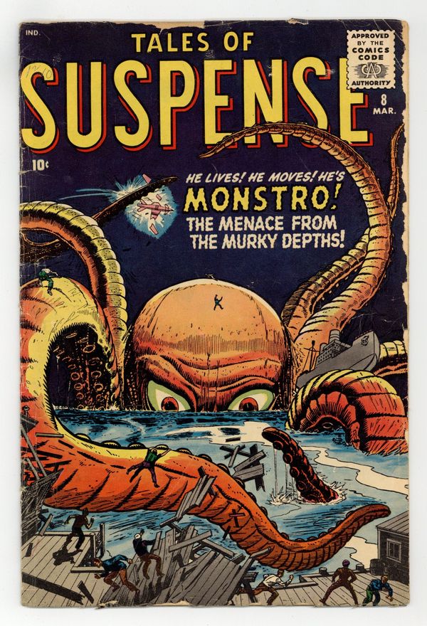 Starts Jan 3 Cover pencils by Jack Kirby, inks by Dick Ayers. "Monstro... The Menace from the Murky Depths!", pencils by Jack Kirby, inks by Dick Ayers; A giant octopus appears in the harbor of a communist seaport; An American marine biologist is sent to help, and finds that it is an ordinary octopus enlarged by communist nuclear tests, and will shrink back in 24 hours. "The Story of Sammy Snork!", art by Bill Everett; A criminal accidentally boards a Martian flying saucer and ends up on display in a zoo. "I Am the Changing Man!", art by Steve Ditko; A shape-changing alien assumes the identity of trusted figures to sow panic; He is caught when he assumes the form of a dog he sees on a poster, not noticing that it is on a space flight for the next year. "The Recipe" text story. "The Runaway Planet!", art by Doug Wildey; A professor believes that a planet on a collision course will not destroy Earth because of the power that governs the universe; The planet is actually a spaceship come to greet the humans. "It Walks by Night!", art by Don Heck; Robots are outlawed after a series of malfunctions; One man builds a robot in secret, he is found out and the robot destroyed but the man, a robot in disguise, escapes. 36 pages, full color. Cover price $0.10. Grade: GD+ 2.5 explanation of grade Condition: Used (collectible)