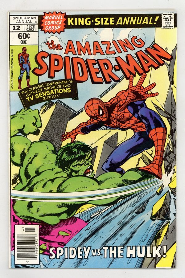 This annual reprints the web-slinger's classic encounter with the Incredible Hulk in Amazing Spider-Man 119 and 120. New cover by John Byrne. First story: "The Gentlemen's Name is Hulk!" Script by Gerry Conway. Art by John Romita. Peter Parker travels to Canada to take pictures of the Hulk for the Daily Bugle! But the simple photo assignment turns into a life and death struggle when the Green Goliath attacks the Maskattawan Dam! Second story: "The Fight and the Fury" Script by Gerry Conway. Pencils by Gil Kane. Inks by John Romita. The wall-crawler and General Thunderbolt Ross track the Hulk to the site of the 1967 World Fair in Montreal! But when the Hulk gets his hands on Spidey, the fun and games come to an end! Cameo appearances by J. Jonah Jameson and Gwen Stacy. (Notes: Spider-Man and the Hulk previously clashed in Amazing Spider-Man Annual 3. Five pages from issue 119 and one page from 120 were omitted to condense the story into the annual format.) 52 pages. Cover price $0.60. Grade: FN/VF 7.0 explanation of grade Condition: Used (collectible)