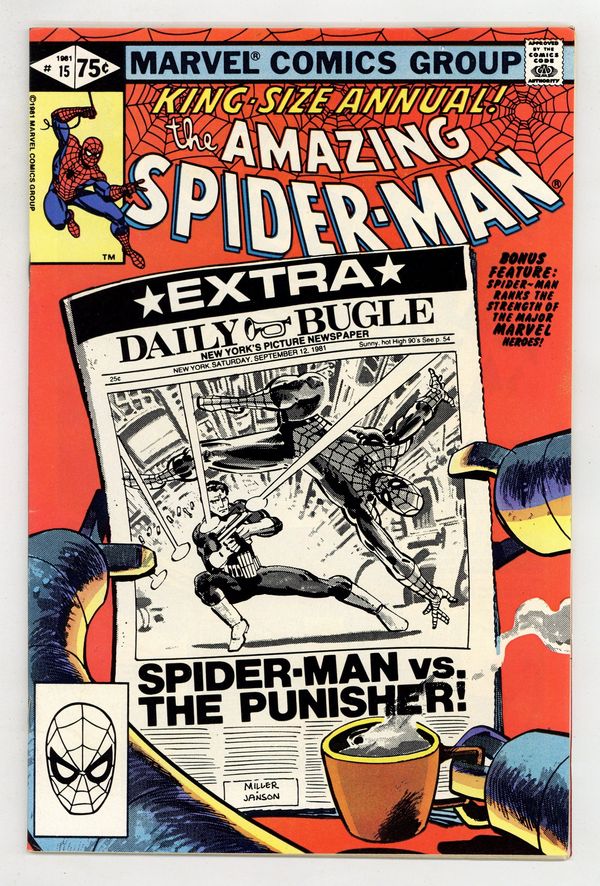 Direct Edition. "Spider-Man: Threat or Menace?" Guest-starring the Punisher. Script by Denny O'Neil. Art by Frank Miller (breakdowns) and Klaus Janson (finishes). Cover by Frank Miller and Klaus Janson. The dynamic art tandem that took the Daredevil series to new heights in the early 1980's teams up to bring Spider-Man and the Punisher together again! But this time the web-slinger and the gun-toting vigilante are not facing the likes of Jigsaw or the Hitman! Their adversary is a certain six-armed super-villain...planning nothing less than the murder of five million people! The Punisher takes the first shot at Dr. Octopus in the city morgue! And later on, the wondrous wall-crawler takes the last one at the Daily Bugle! Can Spidey get the story to press before Doc Ock? An excellent annual! Second feature: "Just How Strong Is...Spider-Man?" Script by Mark Gruenwald. Art by Mark Gruenwald (layouts) and Bob Layton (finishes). The heroes of the Marvel Universe are ranked in order of their physical strength. The first tier consists of the Hulk, Hercules, Thor, Wonder Man, and Iron Man. The Thing and the Sub-Mariner headline the second tier. Spider-Man is in the third tier. This may be the first such "power ranking" attempted...thus making it a landmark backup feature. Third feature: "Peter Parker's Apartment!" Script by Roger Stern. Art by Marie Severin and Terry Austin. One-page illustration of Peter's Chelsea apartment correcting the errors in Amazing Spider-Man Annual 13. Fourth feature: "A Gallery of Spider-Man's Most Famous Foes!" Script by Roger Stern. Art by Keith Pollard, Greg LaRocque, and Frank Giacoia. 4 pages of pin-ups featuring the Man-Wolf, Jackal, Punisher, and Tarantula. (Notes: Dr. Octopus previously appeared in Captain America 259. The Punisher appears next in Daredevil 181 & 182. This story was reprinted in the trade paperback The Sensational Spider-Man (1988); and also in the (1994) Complete Frank Miller Spider-Man.) 52 pages. Cover price $0.75. Grade: FN/VF 7.0 explanation of grade Condition: Used (collectible)