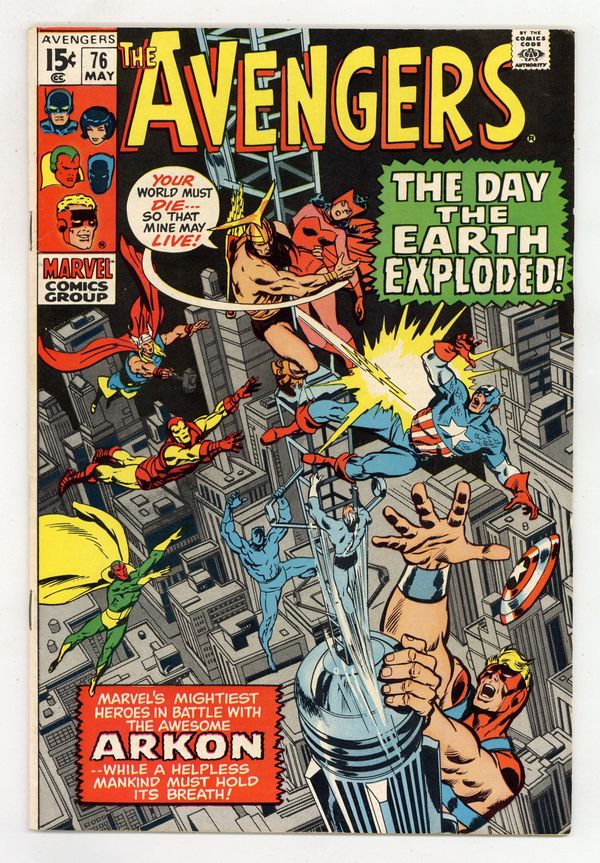 "The Blaze of Battle…the Flames of Love!" Part 2 of 2. Script by Roy Thomas. Pencils by John Buscema. Inks by Tom Palmer. Cover by John Buscema and Tom Palmer. Inside Avengers Mansion, T'Challa and Cap work feverishly to bridge the gap between Earth and Polemachus…the trans-dimensional world where Arkon has taken the Scarlet Witch and several of the world's greatest atomic scientists! The light-generating energy rings of Polemachus have burned out! And the only way to reignite them is via a nuclear explosion in New York City! Wanda tries to reason with Arkon but runs out of time once the Avengers attack! With an urgent fury, the Prince of Asgard and Iron Man cut into the Imperion's best guardsmen! But Arkon slips away with Wanda and teleports back to Earth! Pietro, Goliath, the Vision and the panther soon follow in kind! And (as shown on the dramatic cover) on top of the Empire State Building, Earth's Mightiest Heroes battle Arkon the Magnificent…for the life of the world! A terrific issue! Cameo appearances by the Black Widow and Toad. Avengers Lineup: Black Panther, Captain America, Goliath, Iron Man, Quicksilver, Scarlet Witch, Thor, and the Vision. (Notes: The Avengers appear next in Incredible Hulk 128 for a showdown with the Green Goliath. Arkon returns in Avengers 84. This issue features the first meeting between the Vision and the Scarlet Witch. The letters page includes letters from comics artist Alan Kupperberg and comics historian Peter Sanderson respectively. This two-part story was reprinted in Marvel Super Action 36 & 37.) 36 pages. Cover price $0.15. Grade: FN 6.0 explanation of grade Condition: Used (collectible)
