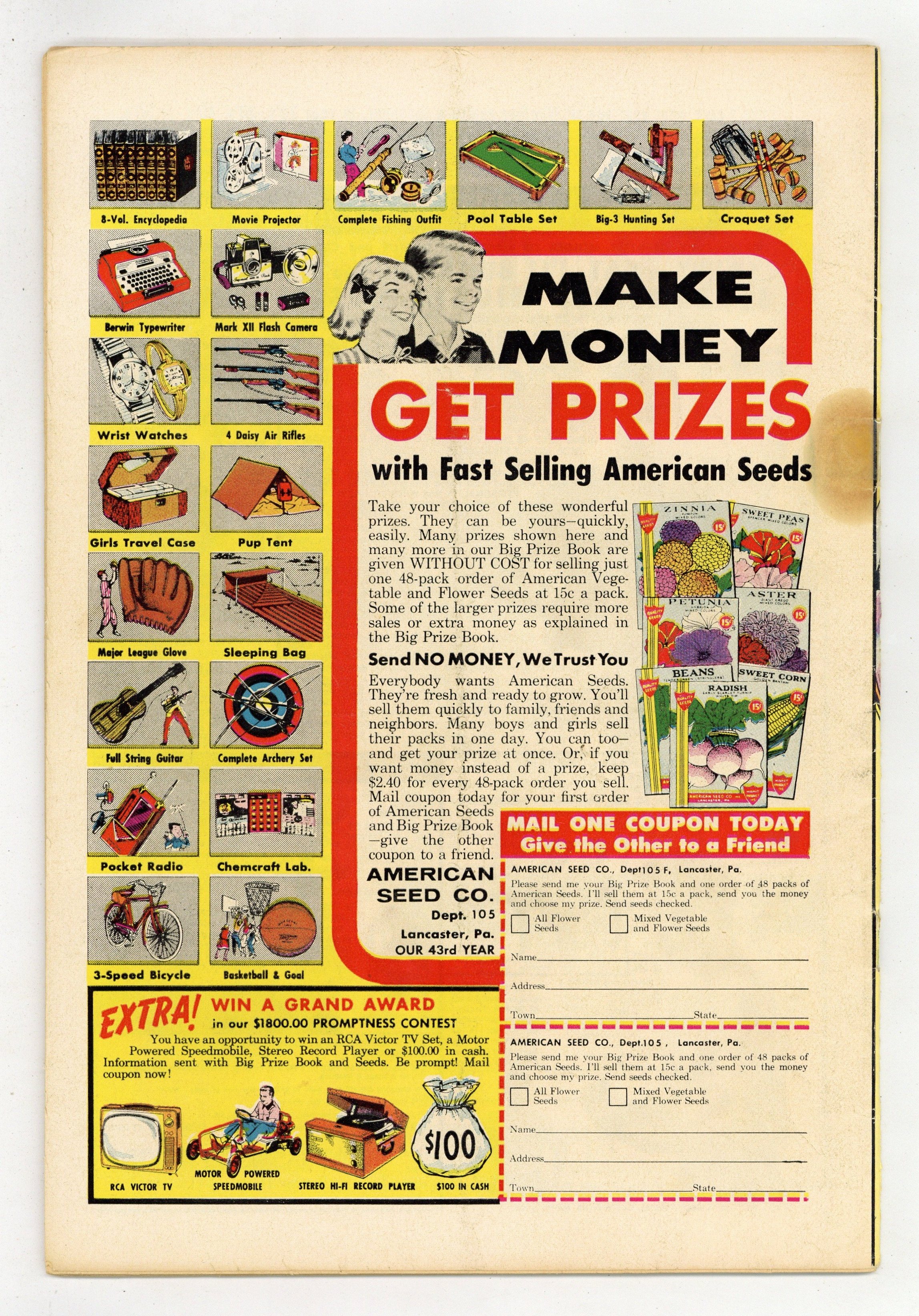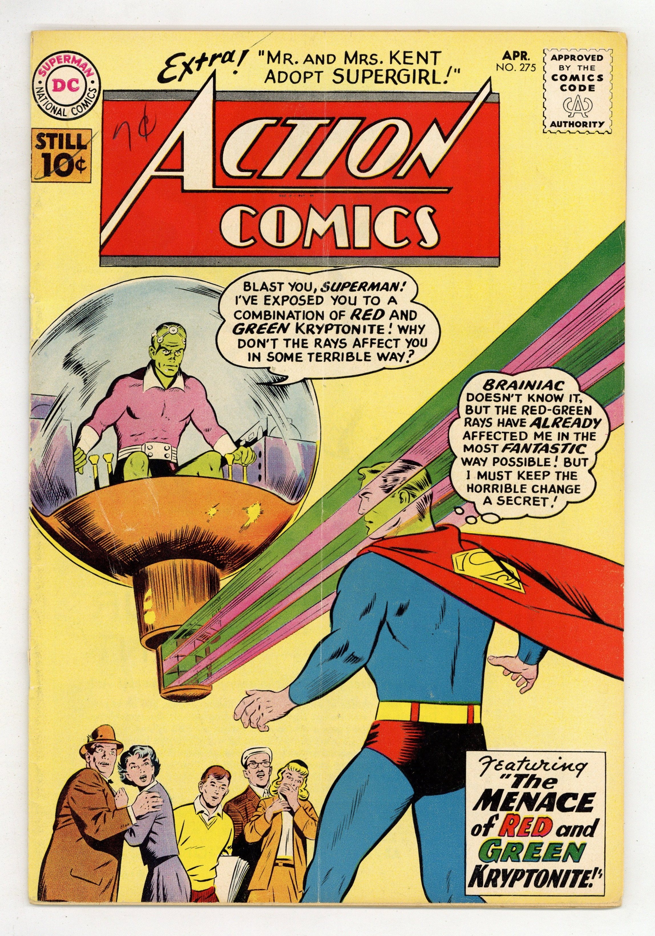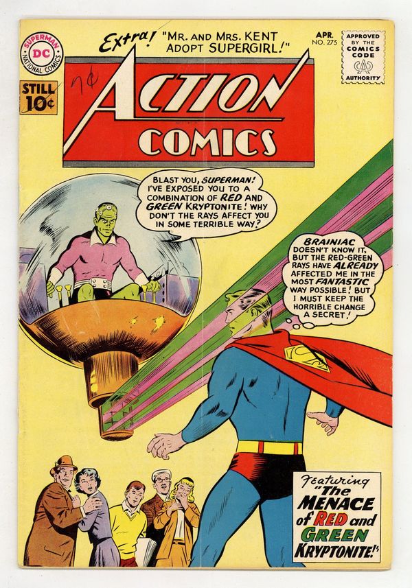 Cover pencils by Curt Swan, inks by Stan Kaye. "The Menace of Red-Green Kryptonite!", script by Jerry Coleman, pencils by Wayne Boring, inks by Stan Kaye; Brainiac travels to Earth to steal some aluminum and also to test his new ray on Superman, a ray which is combined Red and Green Kryptonite; The new ray makes Superman act strangely, forcing him to always wear a hat while performing super deeds. One-page Buck Skinner story by Henry Boltinoff. "Ma and Pa Kent Adopt Supergirl!", script by Jerry Siegel, art by Jim Mooney; Supergirl has a dream where she is sent to Earth in a rocket and is adopted by the Kents rather than her cousin being the one first sent to Earth. One-page Ollie story by Henry Boltinoff. 36 Pages, Full Color. $.10 Cover price $0.10. Grade: GD+ 2.5 explanation of grade Condition: Used (collectible)