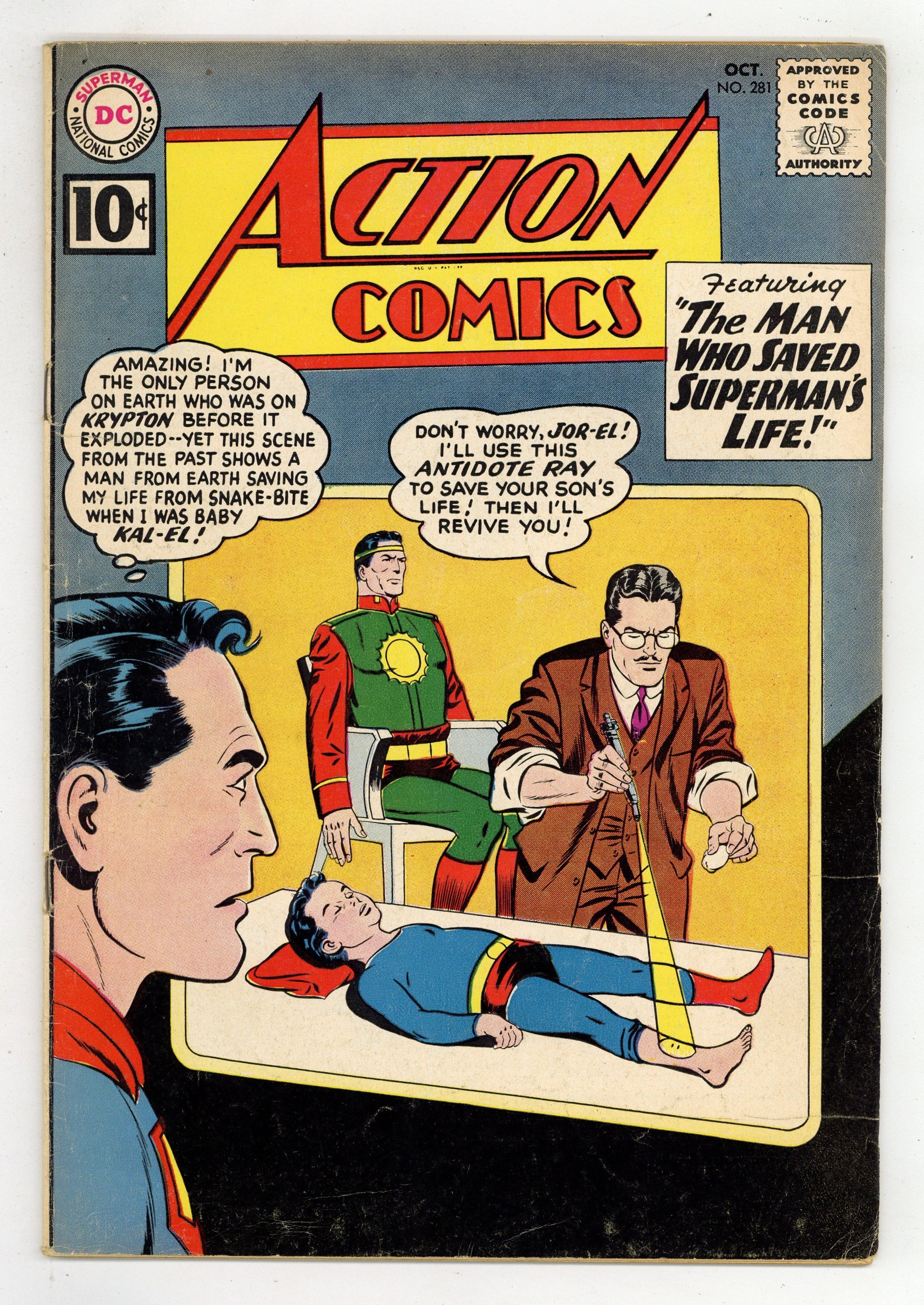 Cover pencils by Curt Swan, inks by Shelly Moldoff. "The Man Who Saved Kal-El's Life!", script by Robert Bernstein, art by Al Plastino; Superman meets Professor Dunn who visited Krypton and meet Jor-El before Krypton exploded. Using the Professor's "Matter-Radio" plans two crooks are on a crime spree. One-page Jerry the Jitterbug story by Henry Boltinoff. Did You Vote for a New Hair Style for Linda (Supergirl) Lee? illustration by Jim Mooney. "The Secret of the Time-Barrier!", script by Jerry Siegel, art by Jim Mooney; The effects of Lesla-Lar's ray have still stripped Supergirl of her powers, but when Superman takes her into the past it is discovered that her super powers return in other time periods. 36 Pages, Full Color. $.10 Cover price $0.10. Grade: VG 4.0 explanation of grade Condition: Used (collectible)
