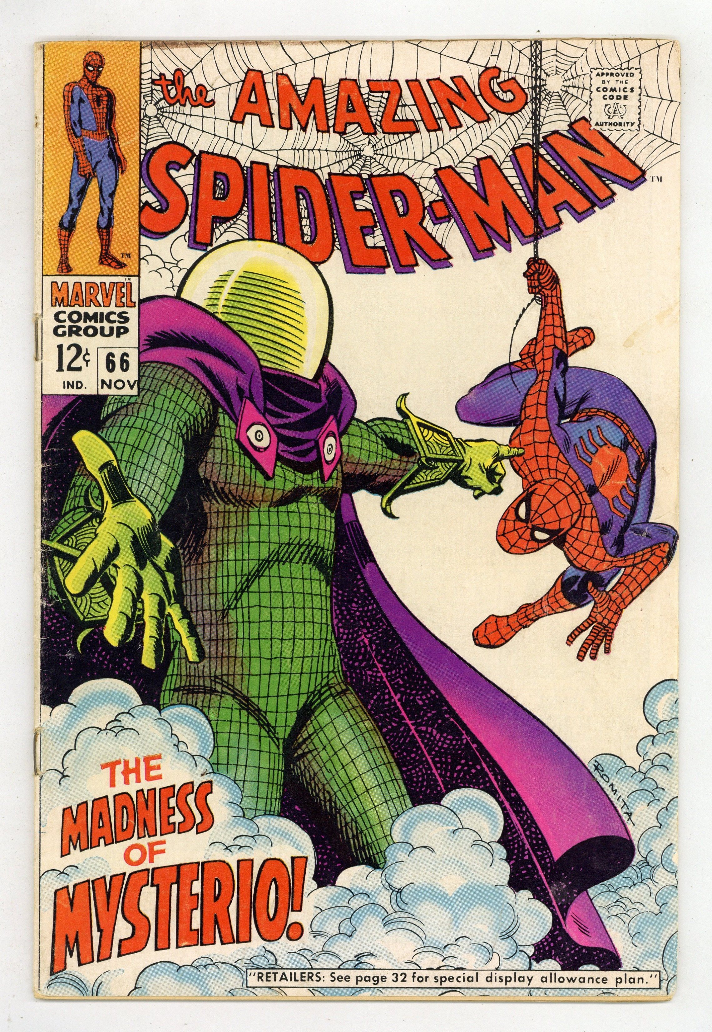 Starts Dec 15 "The Madness of Mysterio!" Part 1 of 2. Script by Stan Lee. Art by John Romita (layouts) and Don Heck (pencils). Inks by Mike Esposito. Cover by John Romita. The Master of Illusion has been plotting revenge against the web-slinger since his bitter defeat in Amazing Spider-Man Annual #4. And this time Mysterio (aka Quentin Beck) hatches a plan involving a miniature amusement park with a miniature Spider-Man! The wall-crawler is about to ride a roller coaster -- whether he realizes it or not! Meanwhile, NormanOsborn has become the Green Goblin again! And he will take his shot at revenge against Peter Parker in Spectacular Spider-Man (1968 Magazine) #2 -- also published this month! Cameo appearances by Betty Brant, Ned Leeds, J. Jonah Jameson, Joe Robertson, Captain Stacy, Gwen Stacy, Aunt May, and Anna Watson. (Notes: The letters page includes letters from comic writers Cary Burkett and Tony Isabella, respectively. This story was reprinted in Marvel Tales #49.) 36 pages. Cover price $0.12. Grade: VG+ 4.5 explanation of grade Condition: Used (collectible)
