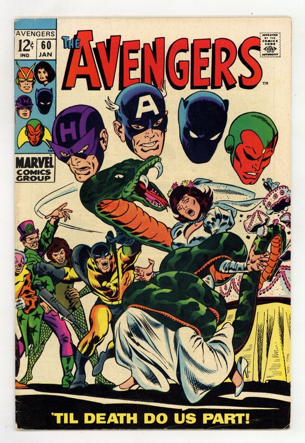 Starts Dec 22 The wedding of the Wasp and Yellowjacket in "...Till Death Do Us Part!" Part 2 of 2. Script by Roy Thomas. Pencils by John Buscema. Inks by Mike Esposito (as Mickey Demeo). Cover by John Buscema and George Klein (with alterations by John Romita). Avengers Mansion is abuzz as Jarvis makes preparations for the surprise wedding of Janet Van Dyne and Yellowjacket! The Wasp's teammates still can't believe she is dumping Hank Pym for thiscostumed stranger! But instead of worrying about Jan and her newly betrothed, maybe the assembled heroes should take a closer look at the caterers! When the happy bride cuts the cake, the Circus of Crime attacks! Will the Ringmaster and his minions rend asunder...what has just been joined together? Not if Goliath has a say in the matter! A fun issue! Cameoappearances by the Fantastic Four, Crystal, Black Knight, Daredevil, Dr. Strange, Iron Man, Nick Fury, Spider-Man, and the original X-Men. Avengers Lineup: Black Panther, Captain America, Hawkeye, Wasp, Yellowjacket, and the Vision. 36 pages. Cover price 12 cents. Cover price $0.12. Grade: VG/FN 5.0 explanation of grade Condition: Used (collectible)