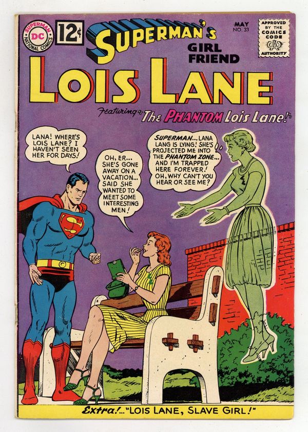 Starts Feb 2 Cover pencils by Curt Swan, inks by George Klein. The Phantom Lois Lane!, pencils by Curt Swan, inks by George Klein; After Superman gives Lois and Lana brooches made of space metals, Lana sends Lois and Lori Lemaris into the Phantom Zone. The Candid Camera Kid!, art by Kurt Schaffenberger; Lois goes undercover at a small-town newspaper to uncover a counterfeiting ring. House ad for The Flash #128. House ad for Superboy #97. Lois Lane, Slave Girl!, art by Kurt Schaffenberger; Lois Lane is sent to ancient Rome by a "Time Bomb" used by criminals so she won't testify against them. 36 Pages, Full Color. Cover price $0.12. Grade: VG- 3.5 explanation of grade Condition: Used (collectible)