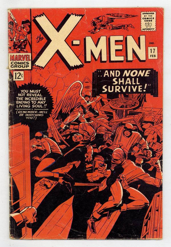 Starts Feb 9 Cover pencils by Jack Kirby, inks by Dick Ayers. ...And None Shall Survive!, script by Stan Lee, pencils by Jack Kirby (p. 1 & layouts, pp. 2–20) and Werner Roth [as Jay Gavin] (pp. 2–20), inks by Dick Ayers; In the aftermath of their battle with the Sentinels, Hank, Bobby and Scott are taken to the hospital with injuries; Iceman is delirious in a coma but his companions recover quickly; When Warren's parents call and say they are dropping by for a visit, Angel flies back to the mansion where he is attacked by a mysterious stranger; Xavier and Cyclops, worried with no word from Angel, also return home and are attacked; Beast and Jean are the last to show up and are also taken down; As Warren's parents arrive at the mansion, they are greeted by Magneto. 36 pgs. $0.12. Cover price $0.12. Grade: GD+ 2.5 explanation of grade Condition: Used (collectible)
