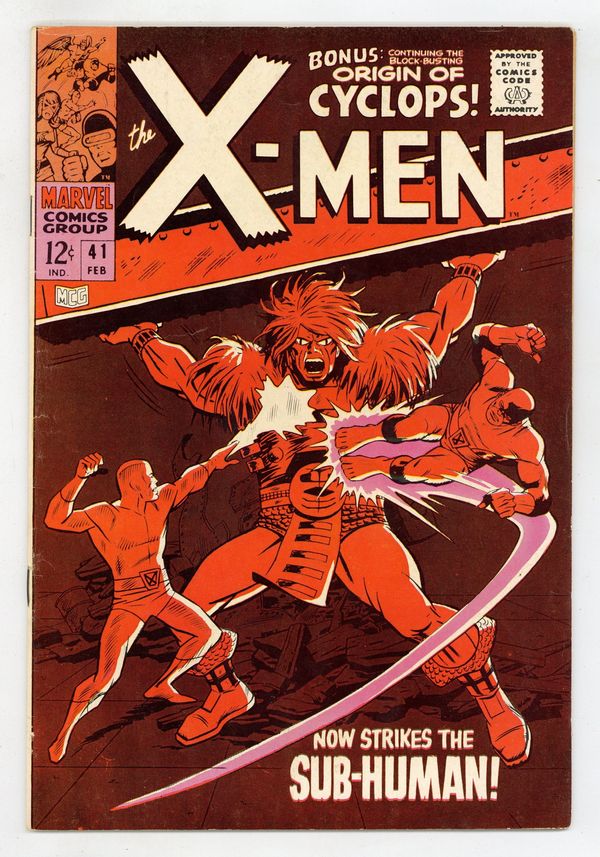 Starts Feb 9 First appearance of Grotesk. Cover pencils by Don Heck, inks by George Tuska. Now Strikes...the Sub-Human!, script by Roy Thomas, pencils by Don Heck, inks by George Tuska; the X-Men battle the Grotesk, the last survivor of the Sub-Humans. The Living Diamond!--The Origins of the Uncanny X-Men, script by Roy Thomas, pencils by Werner Roth, inks by John Verpoorten; Jack O'Diamonds wants Scott Summers to help him battle Professor Xavier; Jack O'Diamonds turns himself into a Living Diamond. 36 pgs. $0.12. Cover price $0.12. Grade: GD+ 2.5 explanation of grade Condition: Used (collectible)