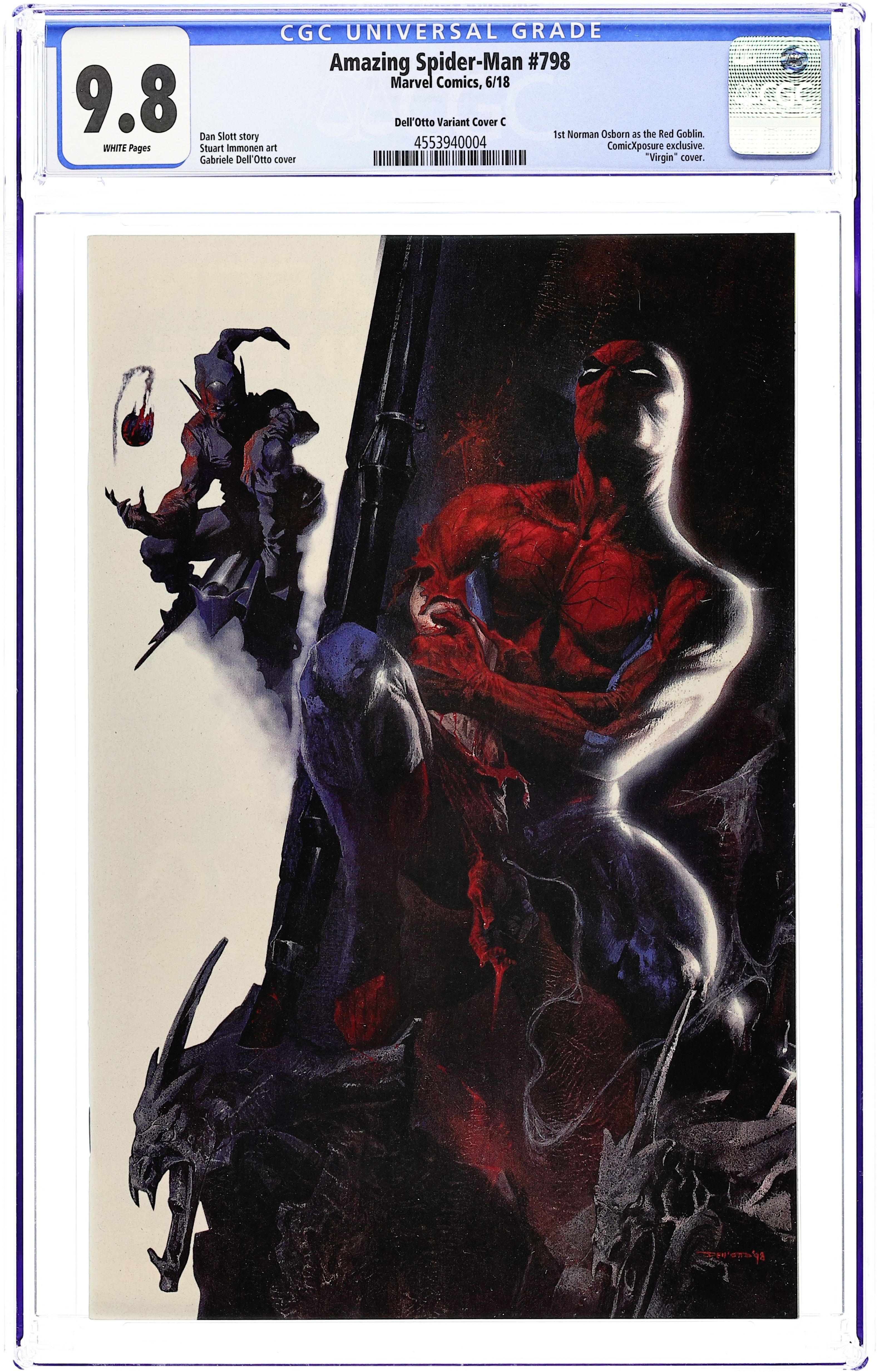 ComicXposure "Virgin" Variant Cover C by Gabrielle Dell'Otto. Go Down Swinging: Part 2 of 4 - Written by Dan Slott. Art by Stuart Immonen. Cover by Gabrielle Dell Otto. Dan Slott's final SPIDER-MAN story continues! The GREEN GOBLIN HAS RETURNED - and he's exacting his ultimate revenge not only on SPIDER-MAN, but on everyone the wall-crawler loves! Norman Osborn's offering NO QUARTER, an ultimatum that threatens to finish PETER PARKER once and for all! 28 pages, full color. Rated T Grade: CGC 9.8 explanation of grade Condition: Used (collectible)