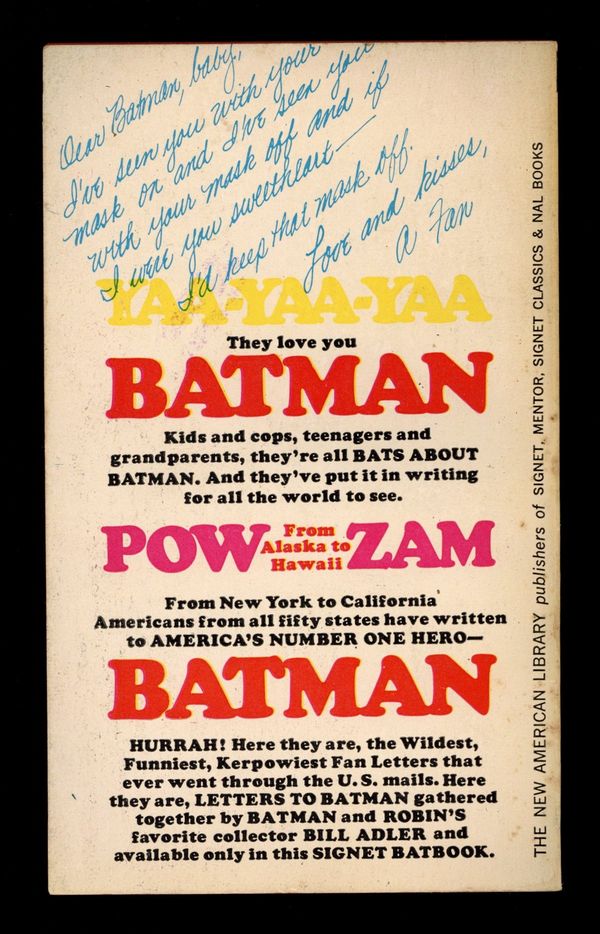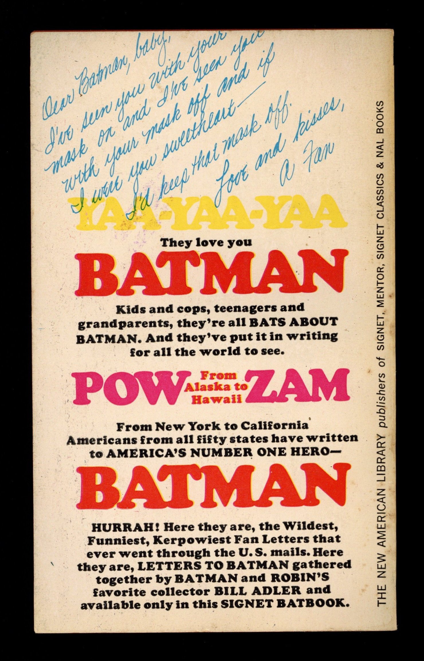 A Collection of the funniest letters sent to Batman during the Batman TV series in 1966. Edited by Bill Adler. Paperback, 4-1/4 x 7", 128 pages, B&W, text only.