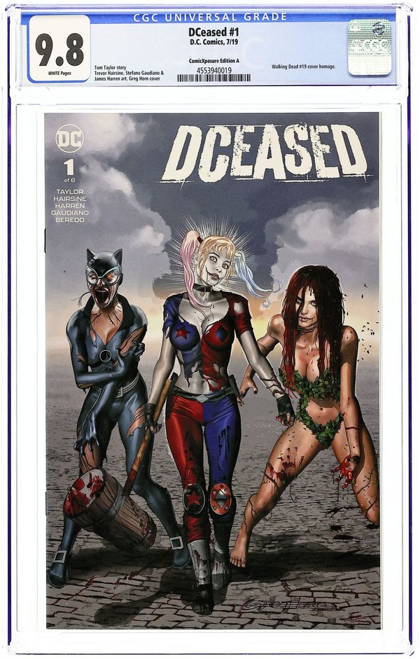 ComicXposure Exclusive Variant Cover by Greg Horn. Written by Tom Taylor. Art by Trevor Hairsine, Stefano Gaudiano, and James Harren.. 'I looked, and there before me was a pale horse! Its rider was Death, and Hades was following close behind him.'-Revelation 6:8 A mysterious techno-virus has been released on Earth, infecting 600 million people and turning them instantly into violent, monstrous engines of destruction. The heroes of the DCU are caught completely unprepared for a pandemic of this magnitude and struggle to save their loved ones first…but what happens to the World's Greatest Heroes if the world ends? New York Times best-selling writer Tom Taylor (INJUSTICE) returns with a terrifying new tale and is joined by artists Trevor Hairsine (LEGENDS OF THE DARK KNIGHT) and Stefano Gaudiano (The Walking Dead). 32 pages, full color. Rated T+ Grade: CGC 9.8 explanation of grade Condition: Used (collectible)