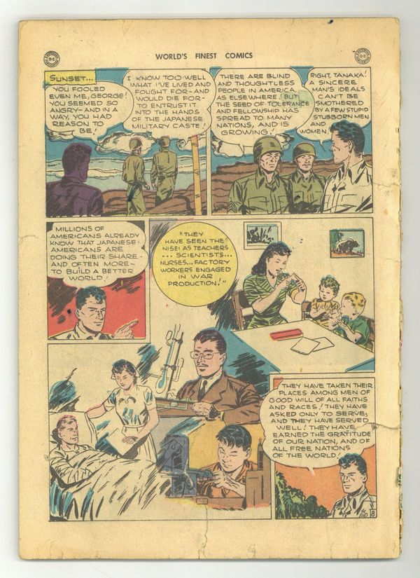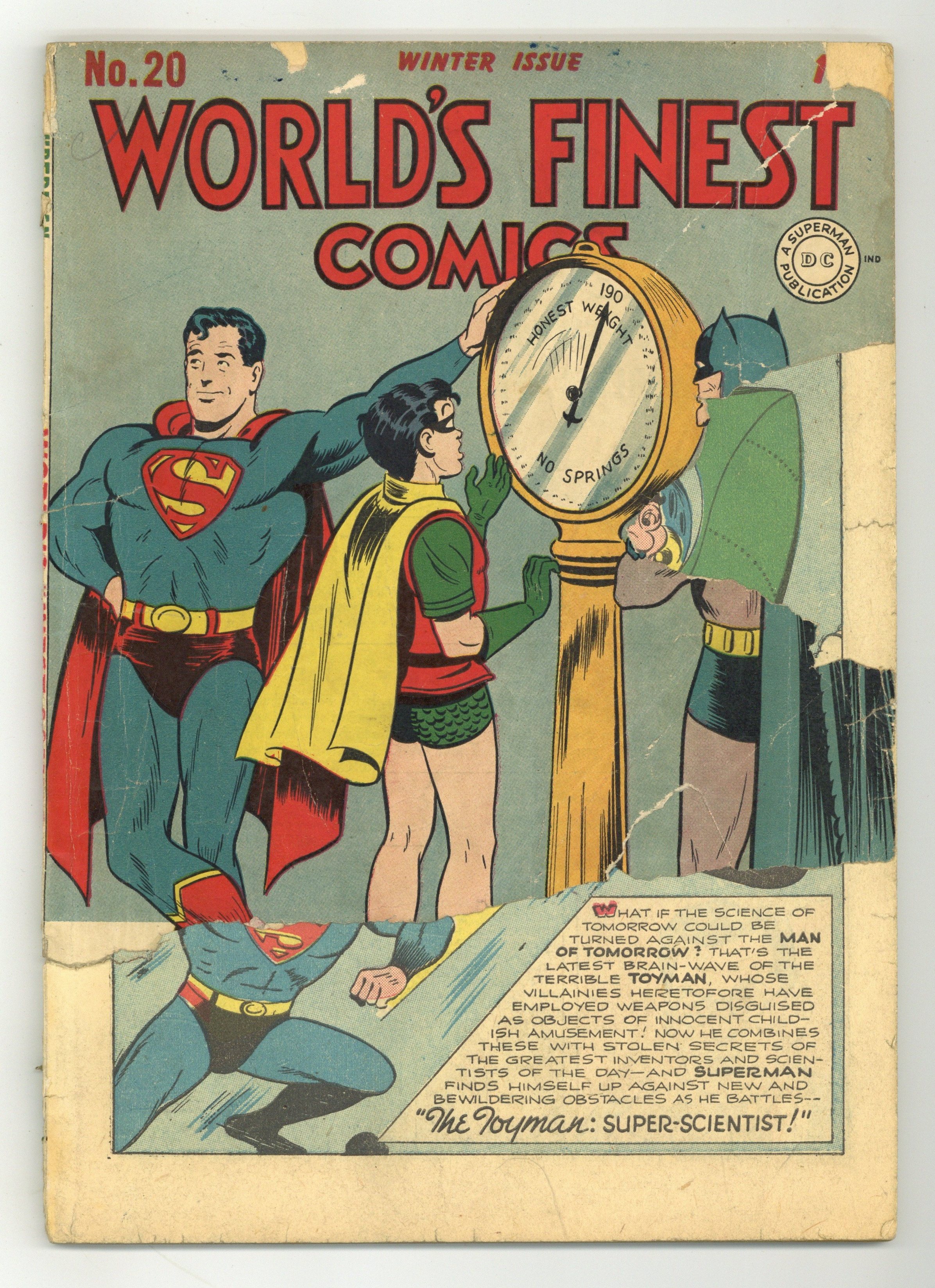 Cover pencils by Jack Burnley, inks by Charles Paris. The Toyman: Super-Scientist! starring Superman, script by Don Cameron [as Jerry Siegel], art by Ed Dobrotka [as Joe Shuster]; Superman must retrieve a super secret invention, the human wavelength detector, from the clutches of the Toyman. Larceny Without Loot starring Green Arrow, script by Joe Samachson, art by Maurice del Burgo. Money Talks starring Zatara, art by William F. White. Brooklyn Botches the Bakas starring The Boy Commandos, script by Joe Samachson, art by Louis Cazeneuve. Foxhole Sailor: A True Adventure of the Fighting Coast Guard, script and art by Joe Simon. George Tanaka, American starring Johnny Everyman, script by Jack Schiff, art by John Daly. King of Coins! starring Batman and Robin, script by Don Cameron, art by Winslow Mortimer [as Bob Kane]; Batman and Robin soon see through a scheme by a wheel-chair bound coin dealer to provide "sure-fire" treasure maps to people in return for half the loot! Tootsie Roll back cover ad, Captain Tootsie and the Return of Dr. Narsty by C.C. Beck and Pete Costanza. 76 pages, Full Color. Cover price $0.15. Grade: PR 0.5 explanation of grade Condition: Used (collectible)