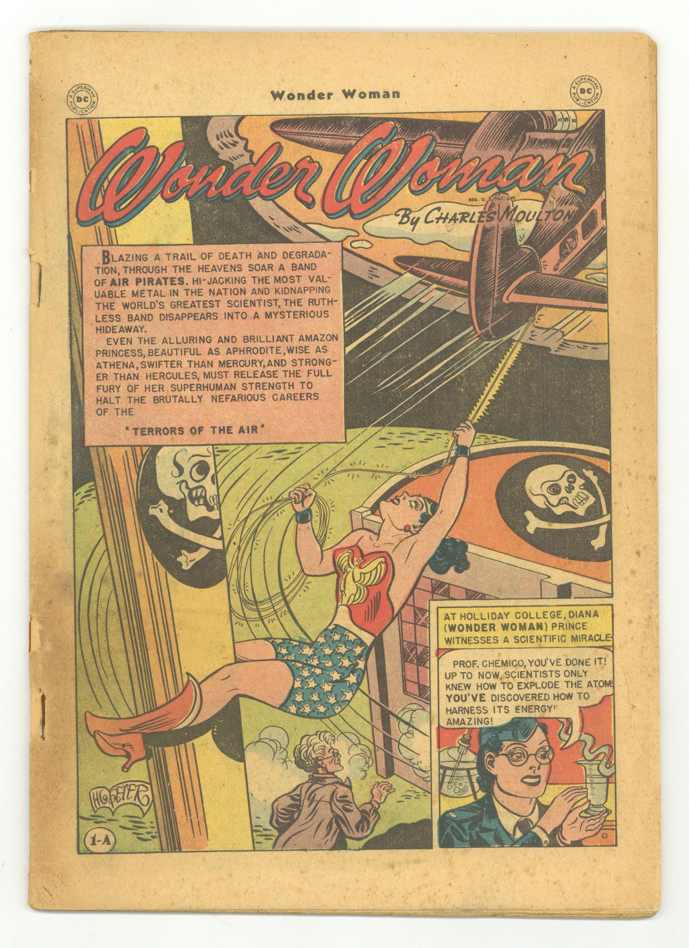 Cover by Harry G. Peter. "Terrors of the Air" (Part 1), script by Joye Hummel (as Charles Moulton), art by Harry G. Peter; Diana Prince has a strange feeling about Etta's friend Nifty, and it's not just that she's secretly an air-pirate, intent on stealing Professor Chemico's formula for harnessing nuclear power. Ton o' Fun one-page cartoon by Harry Lampert. Wonder Women of History: four-page Lucretia Mott bio, script by Alice Marble, art by Robert Sale (as Sal-Pete). "The Rage of Redbeard" (Part 2), script by Joye Hummel , art by Harry G. Peter; While the Karma Monster brings the Air Pirates to Charleston Harbor, circa 1750, where they battle Wonder Woman in an earlier incarnation as sea pirates, Paula transports Steve, Etta and the Holliday Girls back in time to aid the Amazon Princess. Wonder Women of History: four-page Lucretia Mott bio, script by Alice Marble, art by Robert Sale (as Sal-Pete).Ton o' Fun cartoon page by Harry Lampert. Two-page text story, "The Case of the Horseshoe Nail" by Jim Robinson. "The Pirates' Galley Slave" (Part 3), script by Joye Hummel (as Charles Moulton), art by Harry G. Peter; Wonder Woman and friends are reincarnated in Ancient Rome, where they fight for their lives in the arena and on the open seas. 52 Pages, Full Color. Cover price $0.10. Grade: Coverless explanation of grade Condition: Used (collectible)