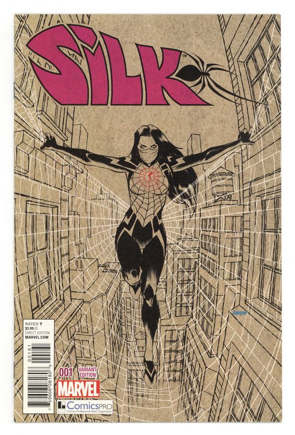 ComicsPro Edition. Written by Robbie Thompson. Art by Stacey Lee. Cover by Dave Johnson. Cindy Moon exploded out of her bunker and into the Marvel Universe when we first learned that she had been bitten by that same radioactive spider in the first arc of AMAZING SPIDER-MAN. She then went on to save Peter Parker's life (more than once!) and traverse the Spider-verse alongside Spider-Woman. Now, as SILK, Cindy is on her own in New York City, searching for her past, defining her own future, and webbing up wrong-doers along the way! 28 pages, full color. Rated T Grade: NM 9.4 explanation of grade Condition: Used (collectible)