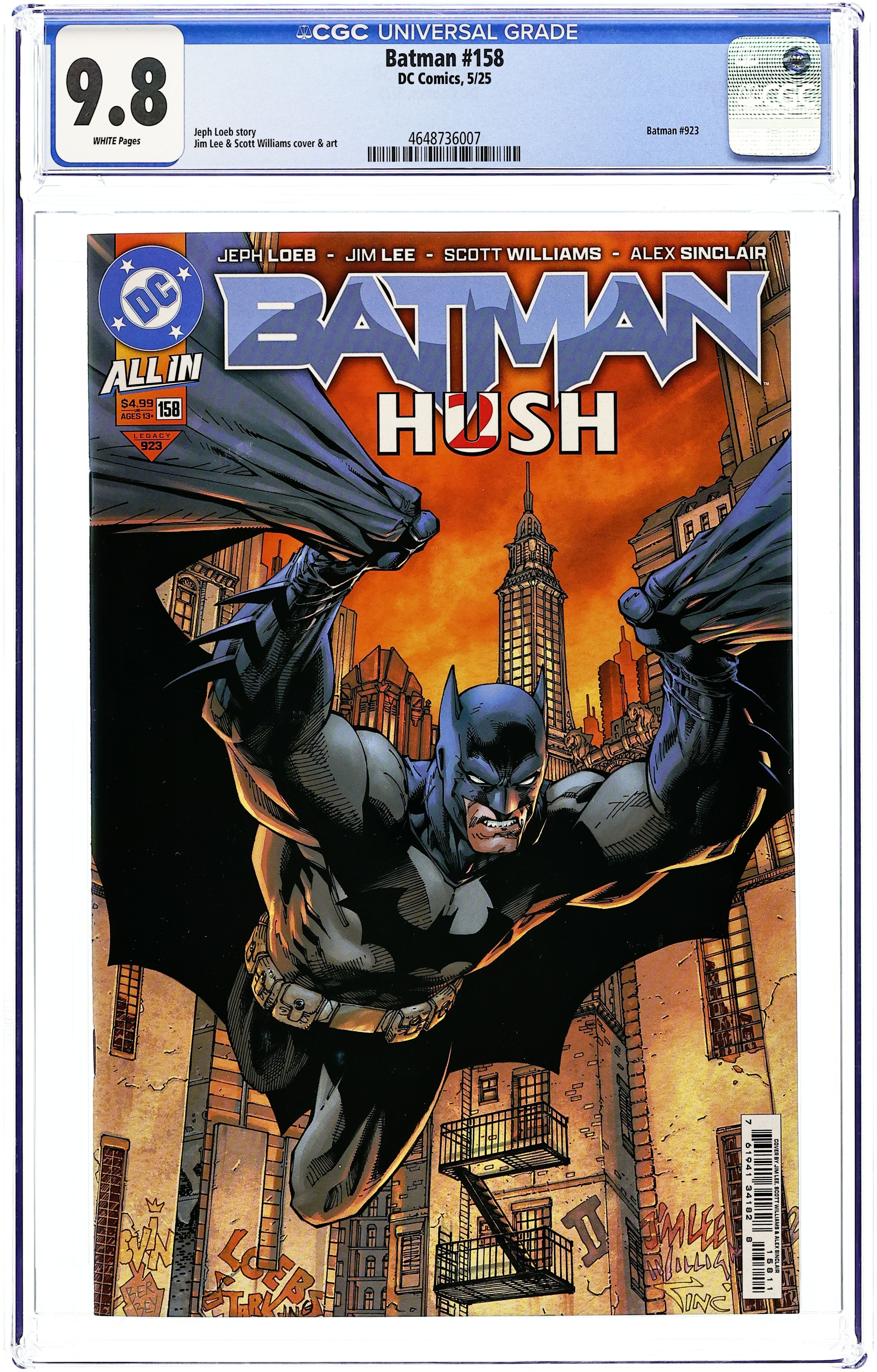 Ends Dec 8 7:38 PM CST Bid History 2 bids Current Bid $22 Your Secret Max Bid If you'd like to bid, please log in or register. Written by Jeph Loeb. Art by Jim Lee, Scott Williams. Cover by Jim Lee, Scott Williams. THE HOTLY ANTICIPATED SEQUEL TO THE SMASH-HIT STORYLINE! Jeph Loeb! Jim Lee! An all-new epic saga begins here. Hush returns! 36 pages, full color. Rated T+ Cover price $4.99. Grade: CGC 9.8 explanation of grade Condition: Used (collectible) unless item is a new release