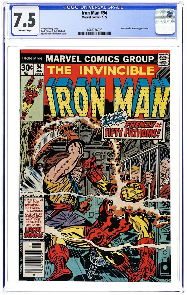 Starts Dec 8 - "Frenzy at Fifty Fathoms!" Part 2 of 2. Story by Gerry Conway. Art by Herb Trimpe and Jack Abel. Cover by Jack Kirby and Al Milgrom. The devilish corsair known as Commander Kraken has kidnaped Iron Man's friends and lured the Avenger into an impossible situation...become the cybernetic pirate's slave or watch his friends die. 32 pages. Cover price $0.30. Grade: CGC 7.5 explanation of grade Condition: Used (collectible)