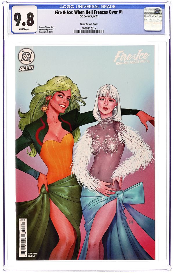 Limited 1 for 25 Retailer Incentive Variant Cover. Written by Joanne Starer. Art by Stephen Byrne. Cover by Kevin Wada. SPINNING OUT FROM THE PAGES OF ABSOLUTE POWER AND THE DC ALL IN SPECIAL! In the pages of DC's Absolute Power event, Fire and Ice had finally achieved what Fire always wanted. The dynamic duo made a glorious return to the ranks of the Justice League--and during a major world crisis, no less! But when the crisis was overcome, the smoke had cleared, and all the superpowers were restored, Ice found herself shooting off uncontrollable spurts of fire, and Fire had ice crystals forming at her fingertips. Oops. With their powers switched and no solution in sight, Fire and Ice tuck tail and regroup in Smallville, where they realize their predicament makes them something worse than has-been heroes: menaces to the local community they've come to love. But Fire's always got a plan, no matter how shortsighted! And when she goes digging around in Zatanna's bag of tricks for a quick fix in the middle of karaoke night...what could possibly go wrong? Aside from, y'know, everything. Again. Fire & Ice: Welcome to Smallville writer Joanne Starer teams up with fan-favorite artist Stephen Byrne, returning Fire and Ice to Kansas for another raucous romp full of heart and humor in the midst of their own personal hell! 32 pages, full color. Rated T+ Cover price $4.99. Grade: CGC 9.8 explanation of grade Condition: Used (collectible) unless item is a new release