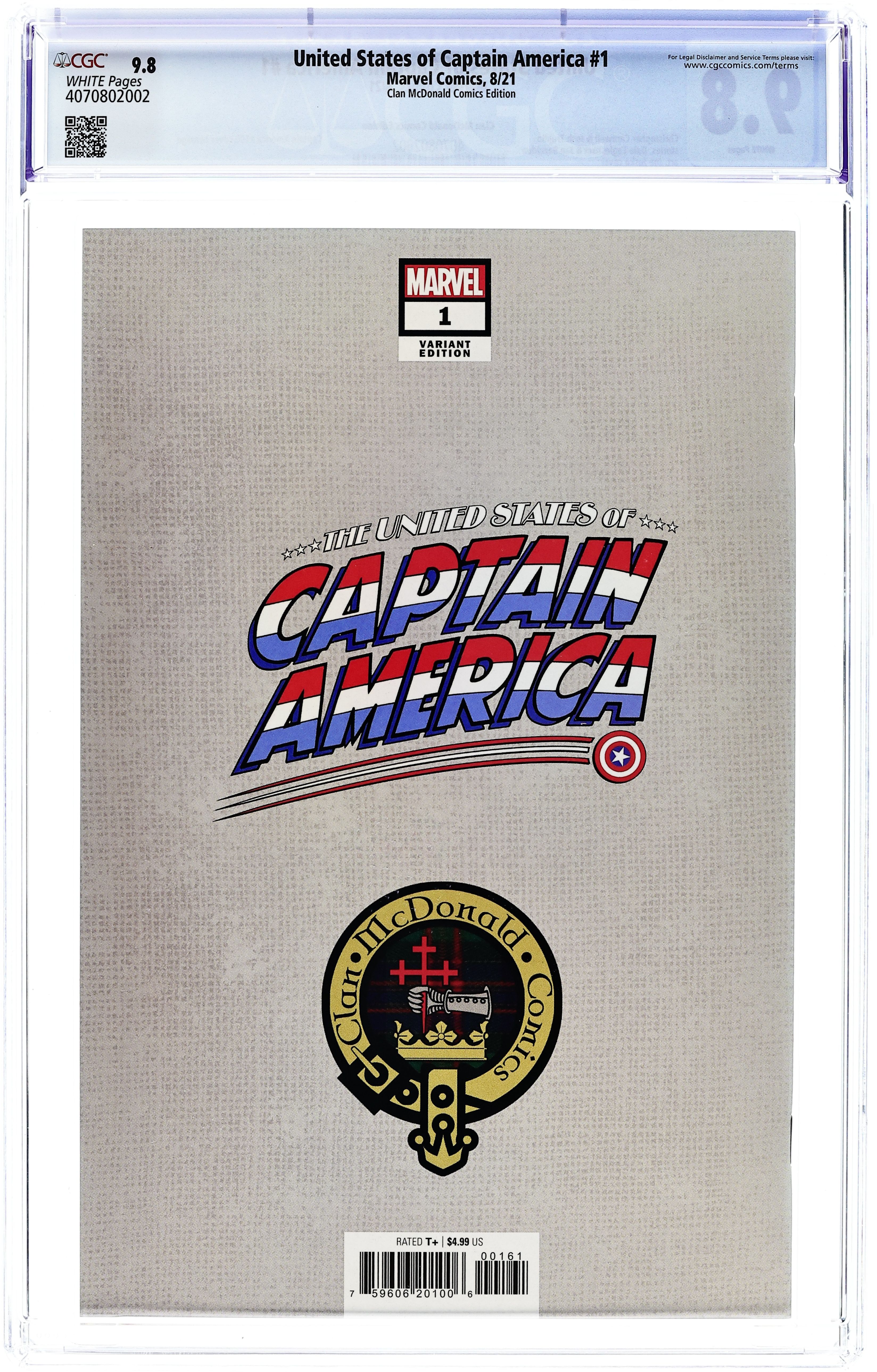 Clan McDonald Comics Exclusive Cover by Joe Jusko. Written by Christopher Cantwell, Josh Trujillo. Art by Dale Eaglesham, Jan Bazaldua. The shield has been stolen! No one understands the value of the shield like those who've wielded it, so Steve Rogers and Sam Wilson set out on a road trip across America to chase down the thief. But instead, they find the Captains, everyday people from all walks of life who've taken up the mantle of Captain America to defend their communities. And for some reason, the shield thief wants them all dead. Can Sam and Steve get to them first? Christopher Cantwell and Dale Eaglesham lead a can't-miss miniseries to celebrate Captain America's 80th Anniversary, joined by a rotating series of creative teams to tell the stories of each new Captain-starting with Aaron Fischer, the Captain America of the railways, brought to life by Josh Trujillo and Jan Bazaldua! 36 pages, full color. Rated T+ Cover price $4.99. Grade: CGC 9.8 explanation of grade Condition: Used (collectible)