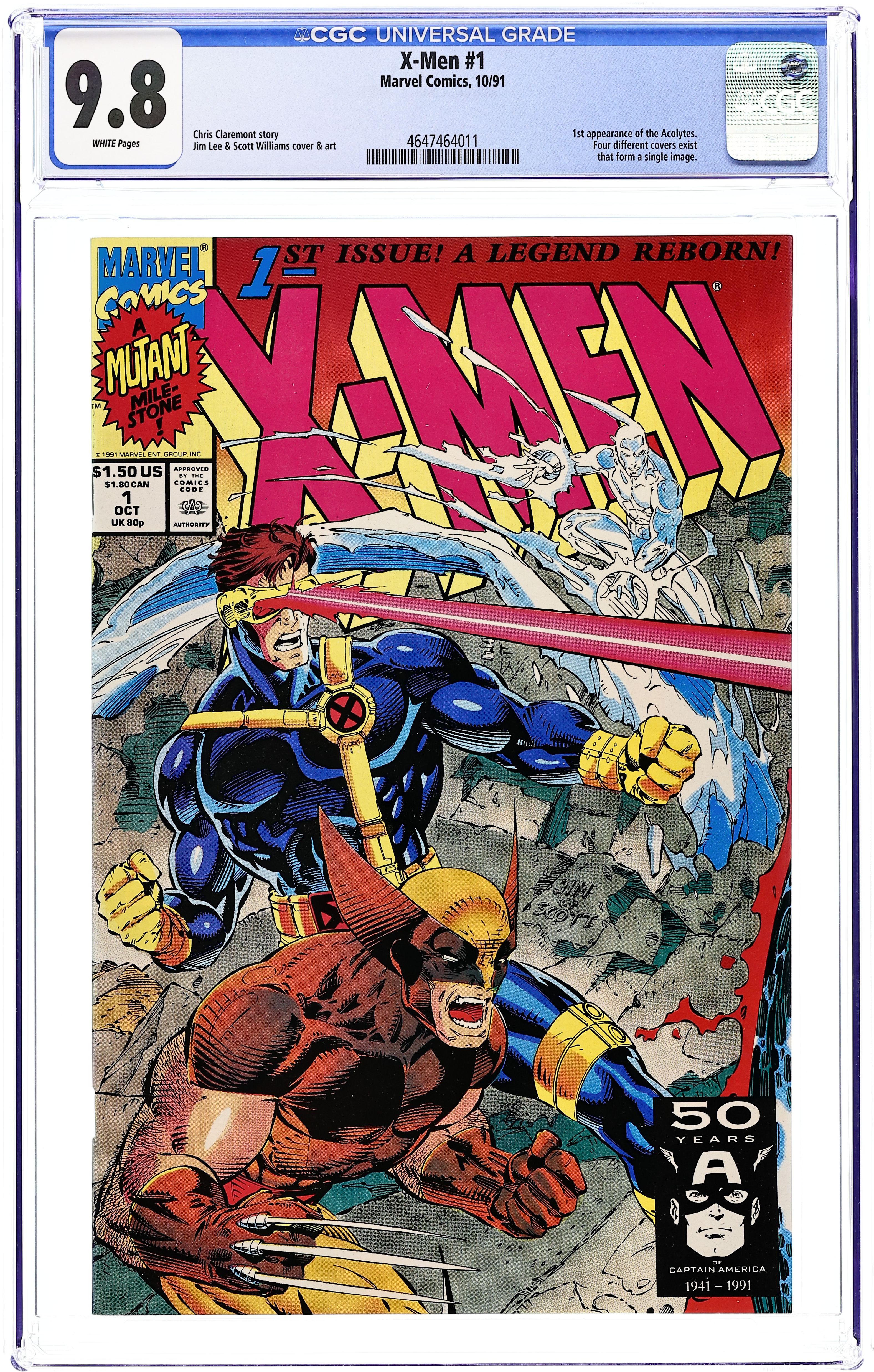 Direct Edition. Cyclops/Wolverine/Iceman cover. Cover pencils by Jim Lee, inks by Scott Williams. Rubicon, script by Jim Lee (Co-Plot) and Chris Claremont, pencils by Jim Lee, inks by Scott Williams; Magneto forms the Acolytes and proclaims Asteroid M a haven for mutants everywhere; But the rest of the world doesn't see it that way; Nick Fury cameo. 2-page pin-up: gallery of X-Men villains. X-Men Sketchbook by Jim Lee. Cover price $1.50. NOTE: Cover C connects to covers 1A, 1B, and 1D to form a single giant image. Cover price $1.50. Grade: CGC 9.8 explanation of grade Condition: Used (collectible)