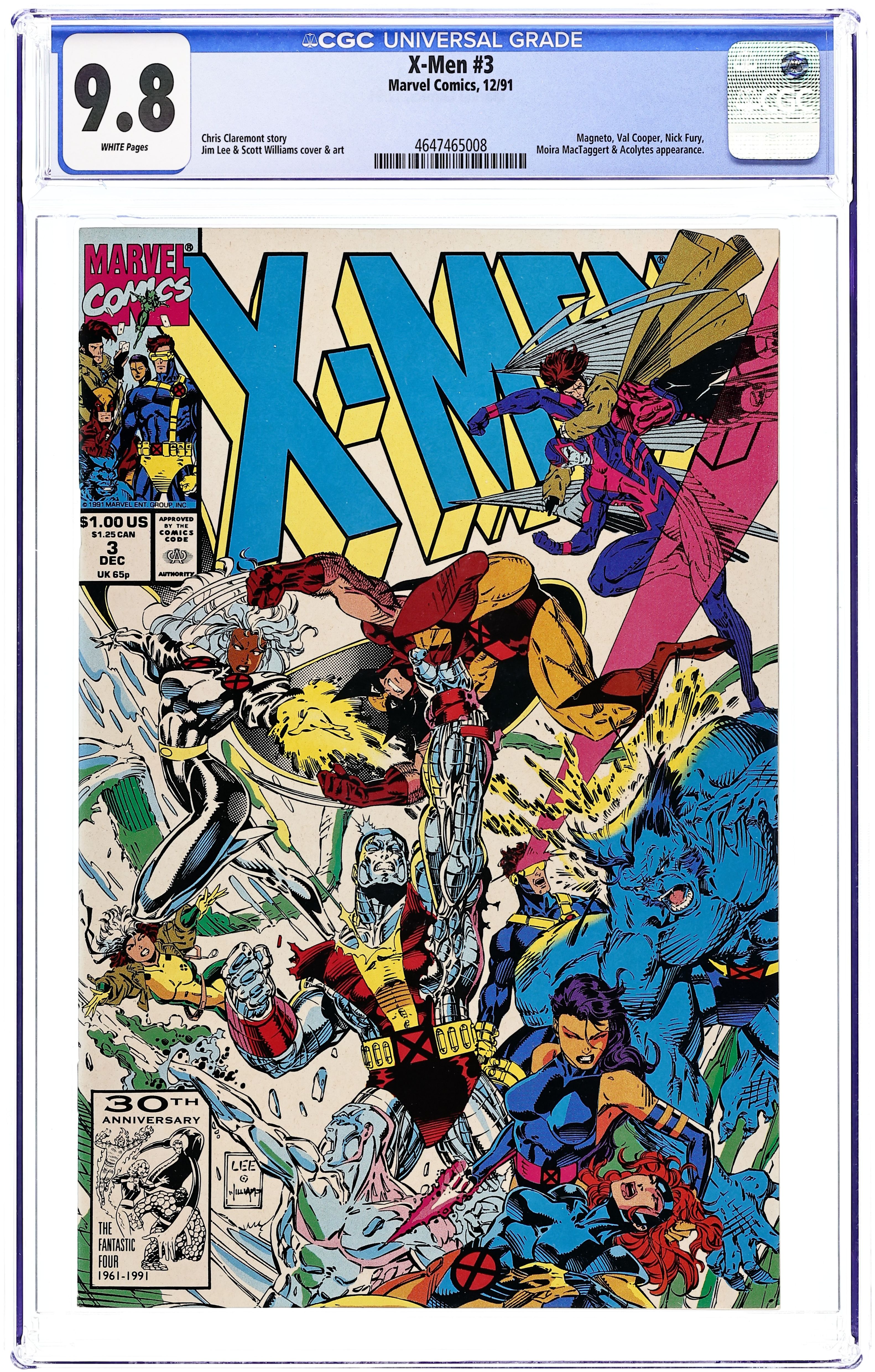 Cover pencils by Jim Lee, inks by Scott Williams. Fallout!, script by Jim Lee (Co-Plot) and Chris Claremont, pencils by Jim Lee, inks by Scott Williams; Cortez betrays his master and Asteroid M is destroyed with the X-Men escaping just in time. Cover price $1.00. Grade: CGC 9.8 explanation of grade Condition: Used (collectible)