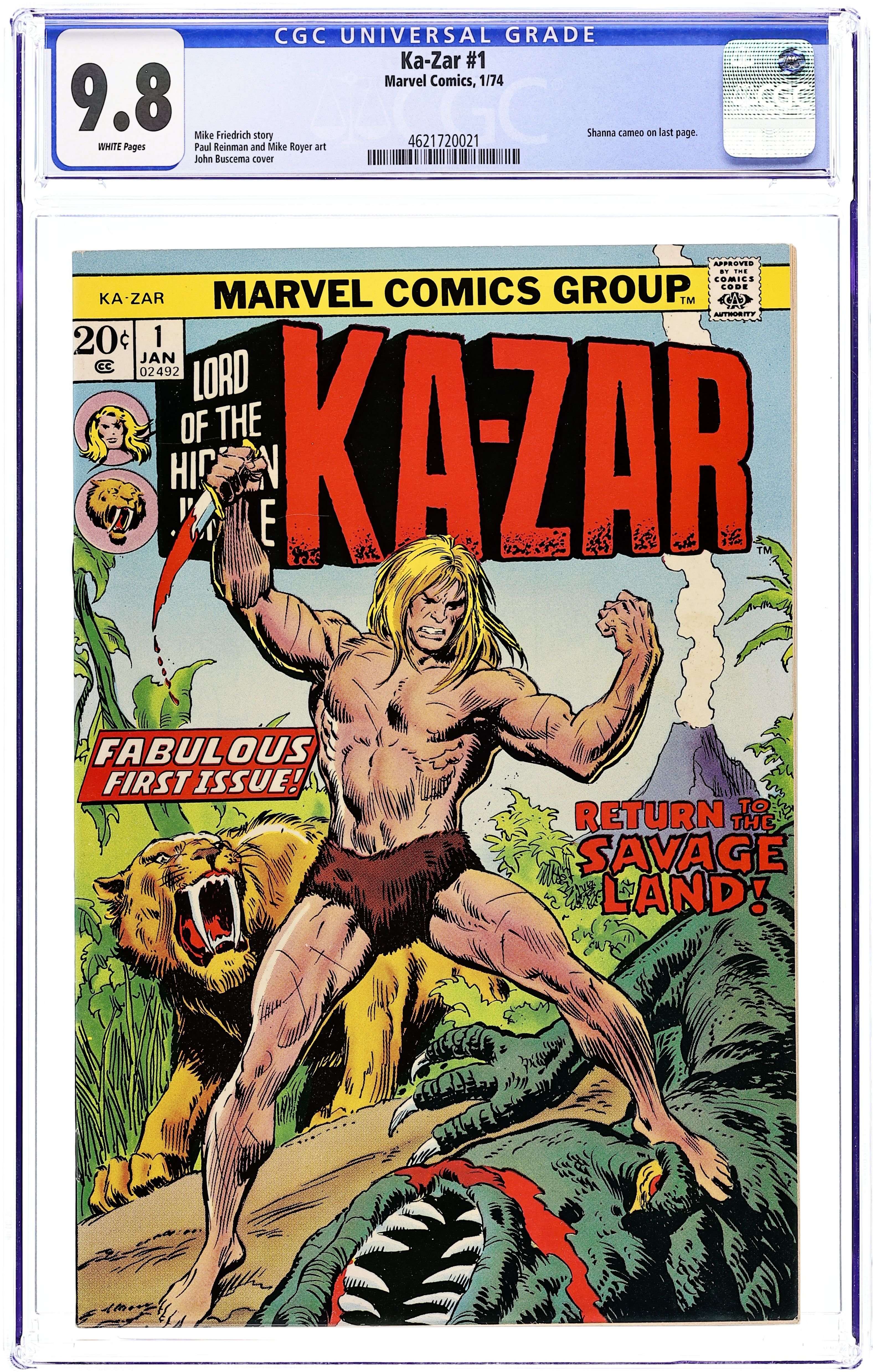 Cover art by John Buscema. "Return to the Savage Land!", script by Mike Friedrich, pencils by Paul Reinman, inks by Mike Royer; The son of an English nobleman, KA-ZAR grew up in the Savage Land alongside his loyal tiger Zabu after the death of his parents; Read his unbelievable origin here! It! Shanna the She-Devil cameo. The Living Colossus house ad. Marvel Bullpen Bulletins. FOOM house ad. 36 pgs., full color. Cover price $0.20. Grade: CGC 9.8 explanation of grade Condition: Used (collectible)