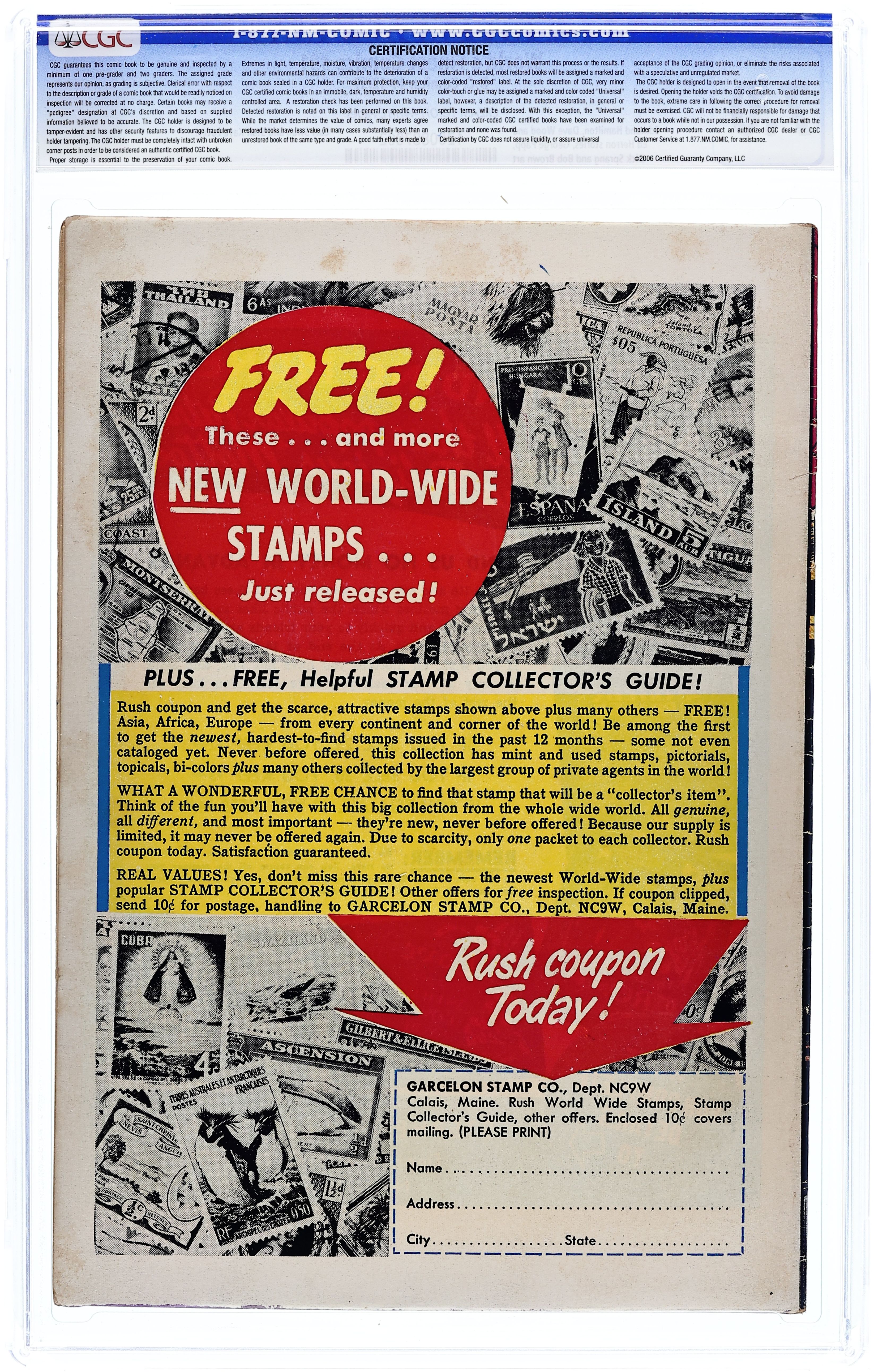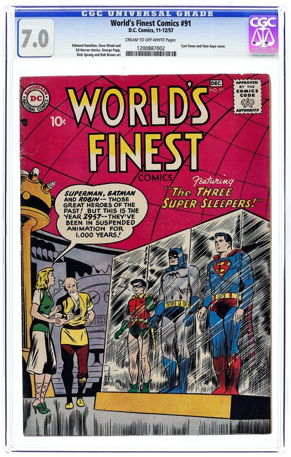 Cover pencils by Curt Swan, inks by Stan Kaye. Teddy Roosevelt: Guardian of Nature public service announcement, script by Jack Schiff, art by Ruben Moriera. The Three Super-Sleepers starring Superman and Batman, script by Edmond Hamilton, pencils by Dick Sprang, inks by Stan Kaye; s Supermna, Batman & Robin chase a wanted felon into a cave, they are unaware that a trap awaits them.....and when they awake, they find themselves 1000 years in the future, having to fight a descendant of Luthor! Broadway Laffs humor page by Harry Lampert. The Chain Letter Arrows starring Green Arrow, script by Ed Herron, art by George Papp. How to Trace Your Family Tree. Sagebrush Sam humor two-pager by Henry Boltinoff. The Teller of Tall Tales starring Tomahawk, script by Dave Wood, art by Bob Brown. 36 Pages, Full Color. Cover price $0.10. Grade: CGC 7.0 explanation of grade Condition: Used (collectible)