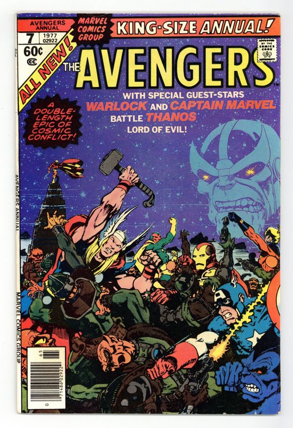 "The Final Threat" Part 1 of 2. Guest-starring Captain Marvel and Adam Warlock. Script by Jim Starlin. Art by Jim Starlin (breakdowns) and Joe Rubinstein (finishes). Cover by Jim Starlin. One of the epochal annuals of the bronze age! A stormy night at Avengers Mansion is interrupted by the sudden arrival of Captain Marvel and Moondragon. The duo feels that the universe is in imminent danger! Their fears are confirmed moments later when Adam Warlock also arrives and delivers troubling news: Thanos has a new plan for obliterating the universe! The evil Titan sends a giant space armada to attack Earth, while he prepares to blow up the sun via his massive star gem! However, the mightiest heroes on Earth intercept the fleet and set their sights on destroying Thanos' instrument of stellar genocide! Tragically though, Warlock falls in battle vs. the mad Titan. Leaving the trio of Iron Man, Thor, and Captain Marvel as the final hope of the universe! Can the Kree warrior, thunder god, and golden avenger triumph over Thanos? Story continues in Marvel Two-in-One Annual 2. Deaths of Gamora, Pip, and Warlock. Avengers lineup: Beast, Captain America, Iron Man, Scarlet Witch, Thor, and the Vision. (Notes: First appearances of the Space Gem, the Mind Gem, and the Reality Gem, and the first time all six Infinity Gems were in a story. Thanos previously appeared in Warlock 15. This annual was reprinted in 1993 in the trade paperback: The Greatest Battles of the Avengers.) 52 pgs. Cover price $0.60. Grade: VG/FN 5.0 explanation of grade Condition: Used (collectible)