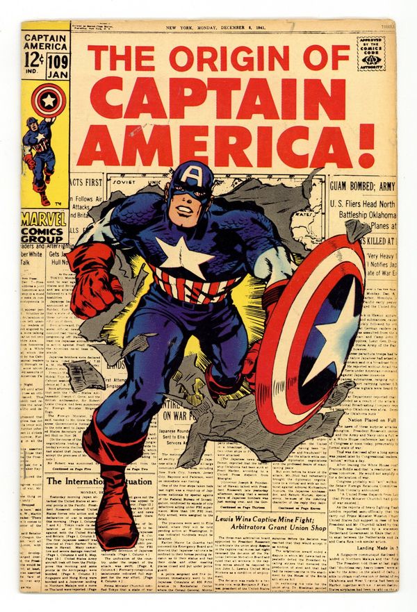 1st printing. Cover pencils by Jack Kirby, inks by Syd Shores . "The Hero That Was!", script by Stan Lee, pencils by Jack Kirby, inks by Syd Shores; Captain America tells Nick Fury his origin, and about how guilty he is over Buckys death; During WWII, Steve Rogers applied for the military, but couldnt pass the physical; He enters a program and is given super soldier formula, which makes him bigger and stronger; Cap battles a Nazi. Letter to the editor from comics writer Don McGregor. NOTE: JC Penney reprint exists with a Stridex ad on the back cover and Marvel Legends AF reprint exists with Red/White Marvel logo in the bottom right corner of front cover. 36 pgs., full color. $0.12. Cover price $0.12. Grade: VG 4.0 explanation of grade Condition: Used (collectible)