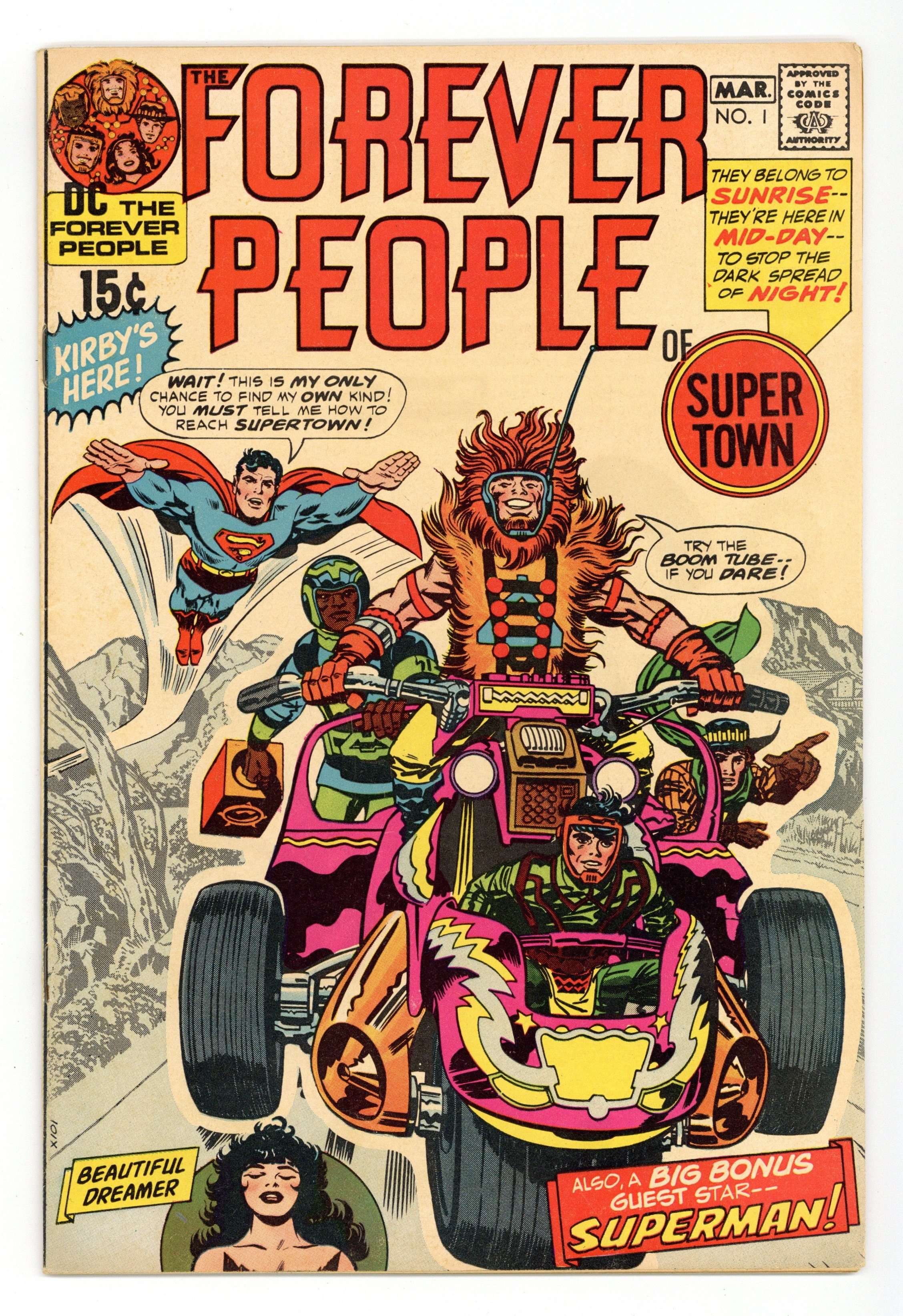 1st full appearance of Darkseid (his 3rd appearance anywhere). Superman guest stars--Odd fact: DC didn't like Kirby's rendition of Superman in this issue, so they had another artist redraw Superman (in the standard Curt Swan fashion of the day) in every panel of the comic! Cover pencils by Jack Kirby, inks by Frank Giacoia; The Forever People come to earth and are greeted by Superman. A Visit with Jack Kirby by Marv Wolfman. 36 pgs. $0.15. Cover price $0.15. Grade: FN 6.0 explanation of grade Condition: Used (collectible)