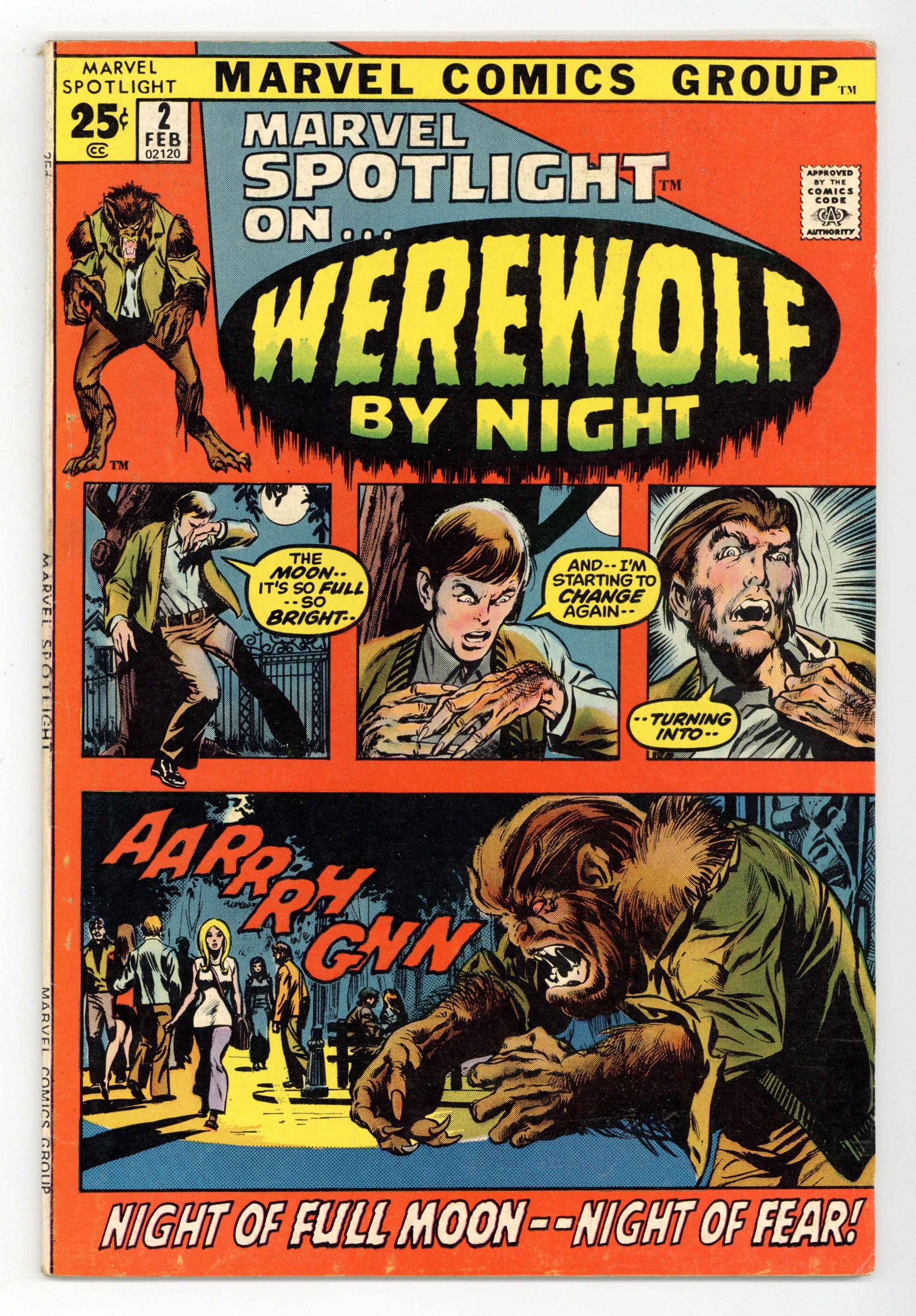 52-page giant. Origin and first appearance of Werewolf By Night. Cover pencils by Neal Adams, inks by Tom Palmer. First Night, script by Roy Thomas (plot); Jean Thomas (plot), and Gerry Conway (script), art by Mike Ploog; Jack learns of the family curse on his eighteenth birthday from his mother on her deathbead; Jack begins to believe that his step-father had his mother killed. House ad for Venus, art by Bill Everett. Where Gargoyles Dwell! starring Venus, script and art by Bill Everett. 52 pages, full color. Cover price $0.25. Grade: VG+ 4.5 explanation of grade Condition: Used (collectible)