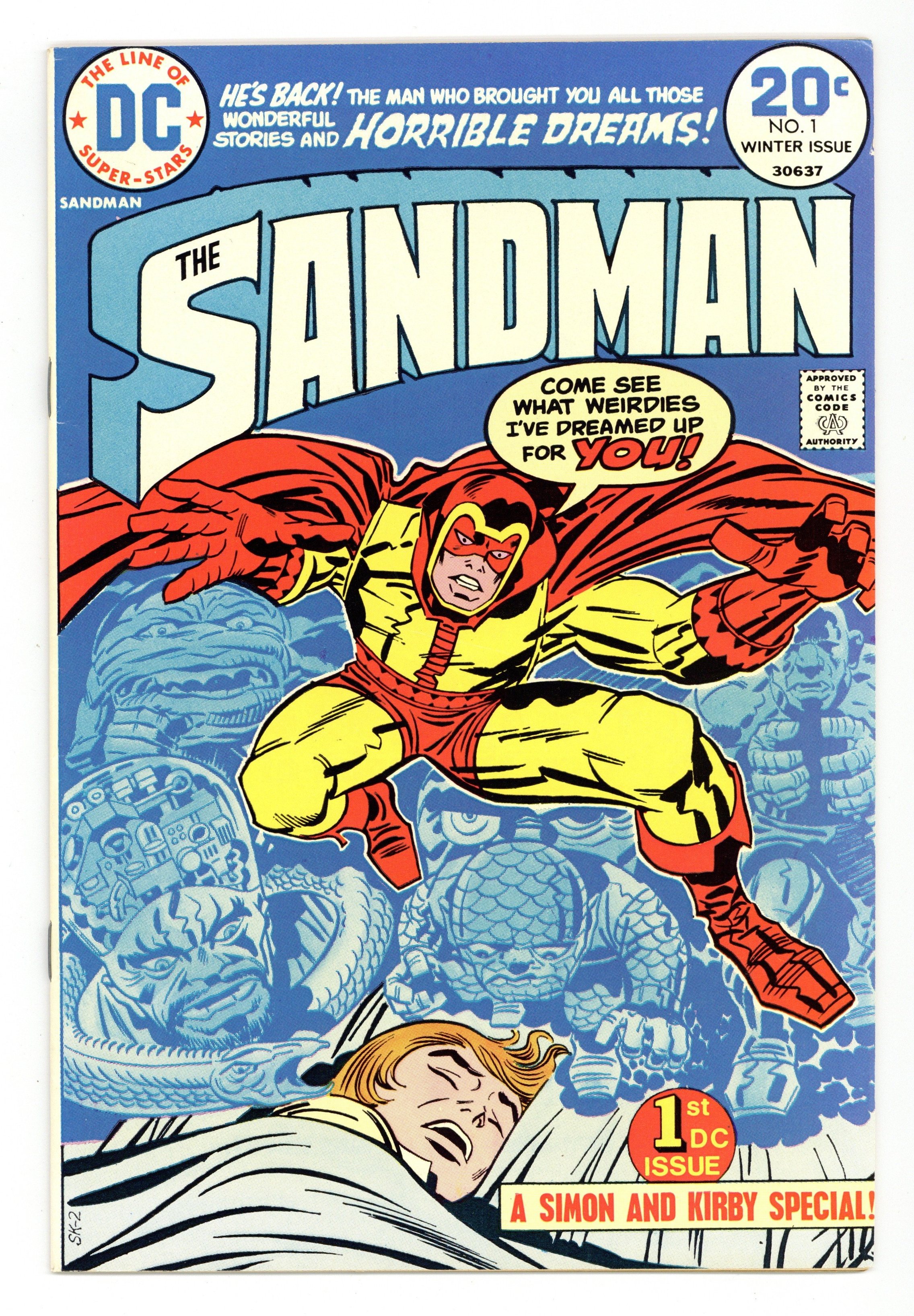 1st Bronze Age Sandman. Last Simon & Kirby collaboration. Cover by Jack Kirby and Frank Giacoia. General Electric, script by Joe Simon, art by Jack Kirby and Mike Royer; When a boy named Jed Walker has a strange dream of a drowning man who appears in reality to give him an evil little doll, it spurs the Sandman to emerge from the Dream Stream into the real world to stop the plans of General Electric. Article on memory and dreams by Alan Asherman. 36 pgs., full color. $0.20. Cover price $0.20. Grade: VF- 7.5 explanation of grade Condition: Used (collectible)