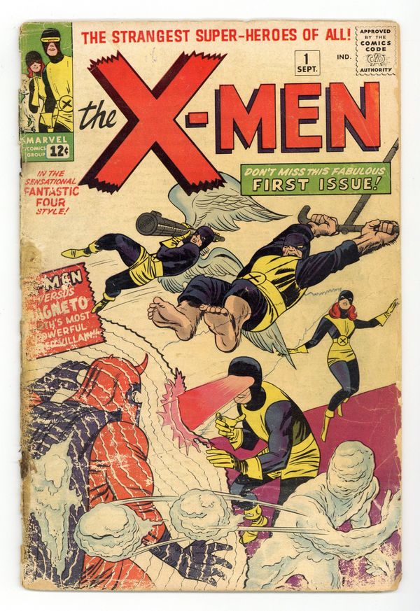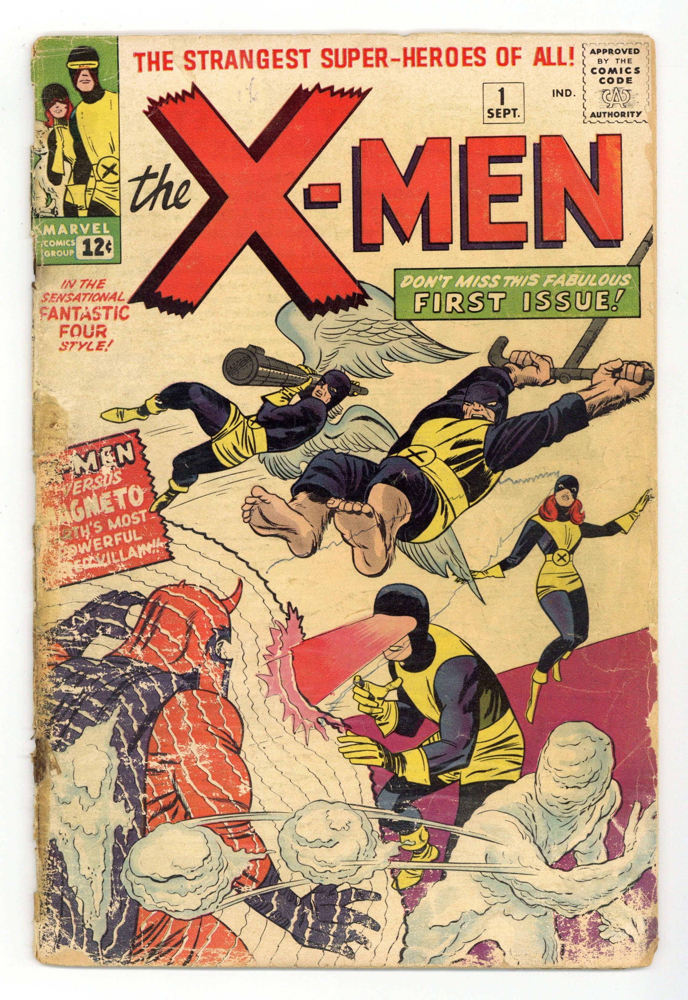 Cover pencils by Jack Kirby, inks by Sol Brodsky. X-Men, script by Stan Lee, pencils by Jack Kirby, inks by Paul Reinman; After a day of training and meeting Jean Grey, a new student at Professor X's school, the X-Men go one their first assignment--stopping a mutant named Magneto from talking over an Air Force base. Full page house ads for Amazing Spider-Man #4 and Sgt. Fury and His Howling Commandos #3. This is it, the first issue of the Uncanny X-Men, and even in the beginning, there was Magneto, the Earth's most powerful super villain. Conceived by Stan Lee and Jack Kirby, this first issue will always remain one of the core books within the Marvel Comics mythos. This is Stan and Jack making history and legend, although no one knew it at the time. First appearances of Professor X, Cyclops, Iceman, the Angel, the Beast, Marvel Girl, and Magneto. 36 pgs. $0.12. Cover price $0.12. Grade: PR 0.5 explanation of grade Condition: Used (collectible)