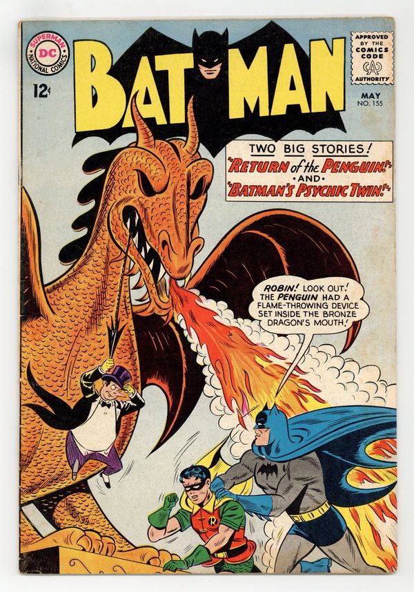 Cover art by Sheldon Moldoff. "Batman's Psychic Twin" starring Batman, Robin, and Kathy Kane, pencils by Sheldon Moldoff, inks by Charles Paris; A rare chemical explosion psychically links Batman with Jo-Jo Gagan, and when the underworld finds out about this, they turn on Gagan and attempt to kill him, believing that the Caped Crusader will perish as well. "The Return of the Penguin" (1st Silver Age appearance of the Penguin) starring Batman, Robin, and Vicki Vale, script by Bill Finger, pencils by Sheldon Moldoff, inks by Charles Paris; Emerging from semi-retirement, due to the mocking of the underworld, the Penguin renews his battle of wits with the Caped Crusaders with a series of new bird-related crimes. Full-page ad for Metal Men # 1. Countdown on Excellence public service announcement, script by Jack Schiff, art by Sheldon Moldoff; Jerry gets a lecture from his father on the importance of doing every job right. 36 Pages, Full Color. Cover price $0.12. Grade: VG 4.0 explanation of grade Condition: Used (collectible)