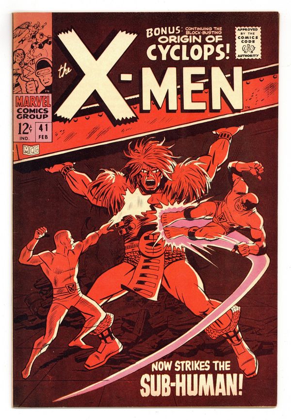 First appearance of Grotesk. Cover pencils by Don Heck, inks by George Tuska. Now Strikes...the Sub-Human!, script by Roy Thomas, pencils by Don Heck, inks by George Tuska; the X-Men battle the Grotesk, the last survivor of the Sub-Humans. The Living Diamond!--The Origins of the Uncanny X-Men, script by Roy Thomas, pencils by Werner Roth, inks by John Verpoorten; Jack O'Diamonds wants Scott Summers to help him battle Professor Xavier; Jack O'Diamonds turns himself into a Living Diamond. 36 pgs. $0.12. Cover price $0.12. Grade: VG 4.0 explanation of grade Condition: Used (collectible)