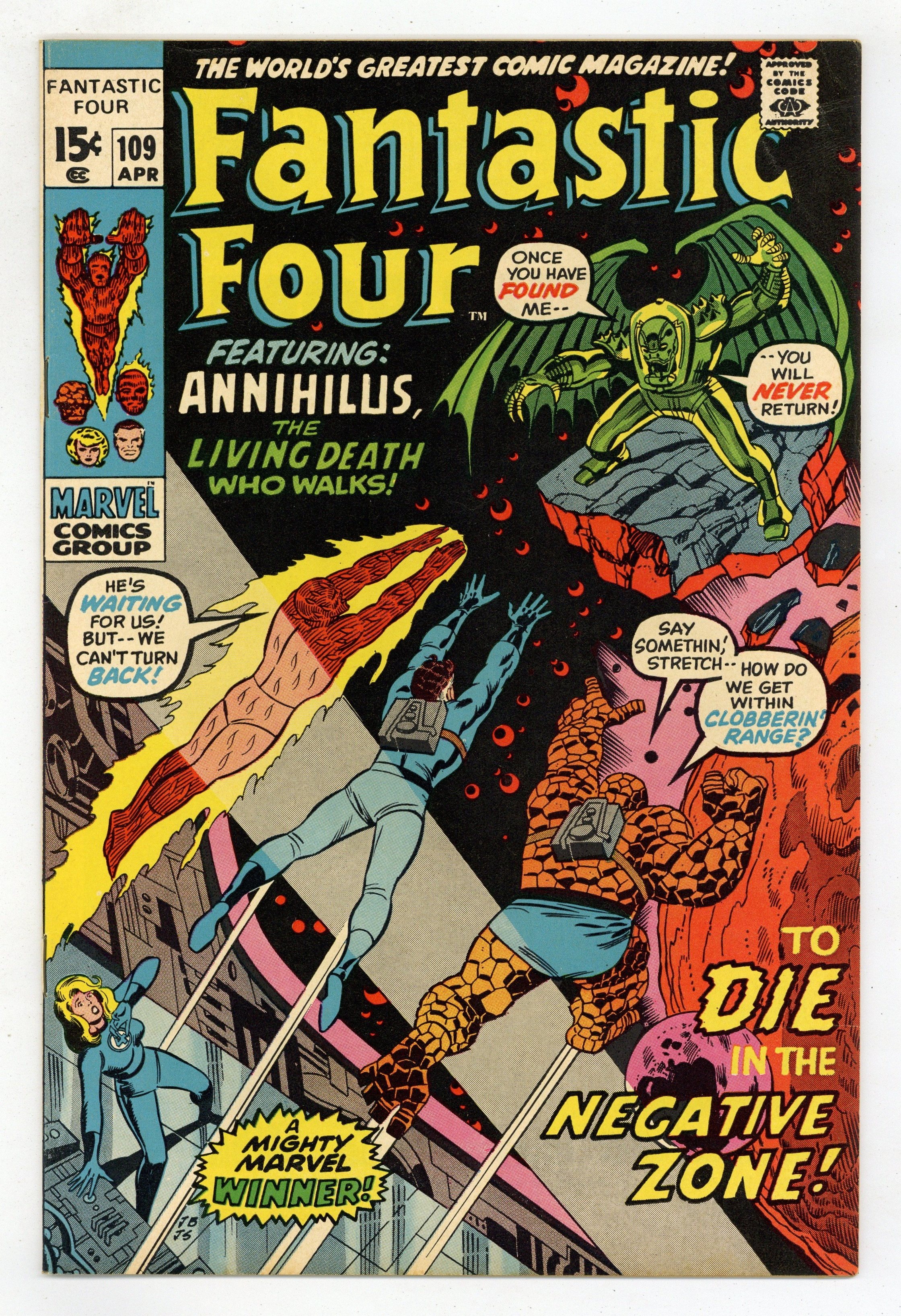 "Death in the Negative Zone!" Script by Stan Lee. Pencils by John Buscema. Inks by Joe Sinnott. Cover by John Buscema and Joe Sinnott. Janus wants to conquer the Negative Zone! Annihilus wants to conquer the Earth! And the Fantastic Four are caught in the middle! But before either the Nega-Man or Annihilus can reach their destinations, they must do battle against one another first! Meanwhile Reed, Ben, and Johnny cross over into the antimatter universe to thwart Annihilus' plans! However, the Lord of the Negative Zone is virtually unbeatable in his kingdom! It's a super showdown: the Thing, Human Torch, and Mr. Fantastic vs. Annihilus! Cameo appearance by Agatha Harkness. (Note: The letters page contains a statement of ownership: average print run 518,737; average paid circulation 285,639.) 36 pages Cover price $0.15. Grade: VG+ 4.5 explanation of grade Condition: Used (collectible)
