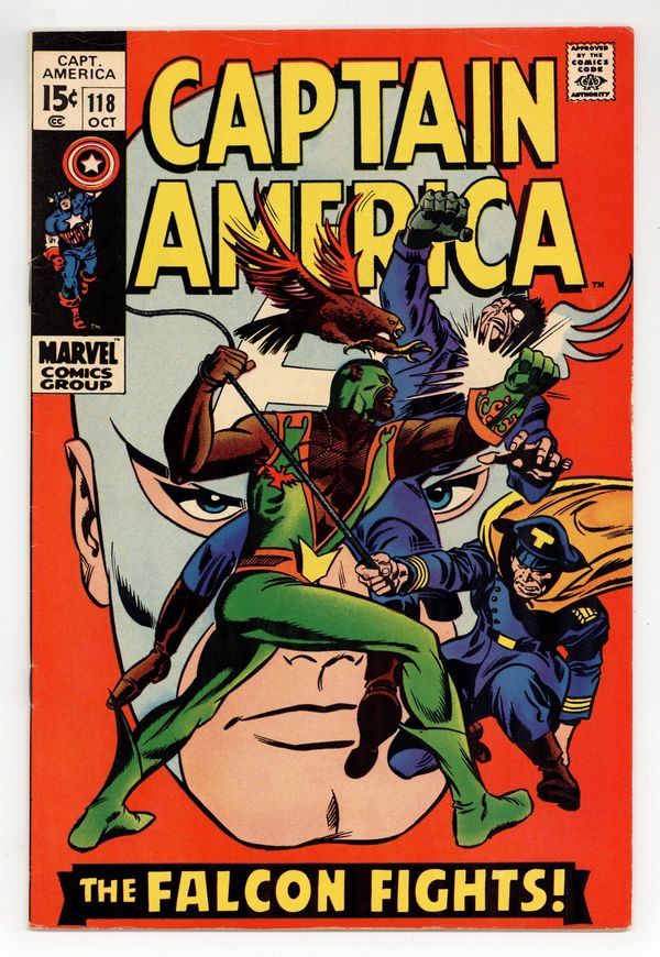 Cover pencils by Gene Colan and John Romita (alterations), inks by Joe Sinnott and John Romita (alterations). "The Falcon Fights On!", script by Stan Lee, pencils by Gene Colan, inks by Joe Sinnott; Captain America and the Falcon battle the Exiles, who are unaware that their former leader has used the Cosmic Cube to switch bodies with Cap; Rick Jones gives up the identity of Bucky; The Red Skull prepares for a battle with Cap. Letter to the editor from comics writer Steve Gerber. 36 pgs., full color. $0.15. Cover price $0.15. Grade: FN+ 6.5 explanation of grade Condition: Used (collectible)