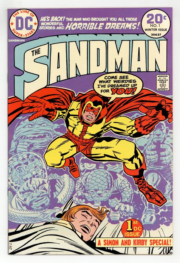 Purple cover variant. 1st Bronze Age Sandman. Last Simon & Kirby collaboration. Cover by Jack Kirby and Frank Giacoia. General Electric, script by Joe Simon, art by Jack Kirby and Mike Royer; When a boy named Jed Walker has a strange dream of a drowning man who appears in reality to give him an evil little doll, it spurs the Sandman to emerge from the Dream Stream into the real world to stop the plans of General Electric. Article on memory and dreams by Alan Asherman. 36 pgs., full color. $0.20. Cover price $0.20. Grade: FN 6.0 explanation of grade Condition: Used (collectible)
