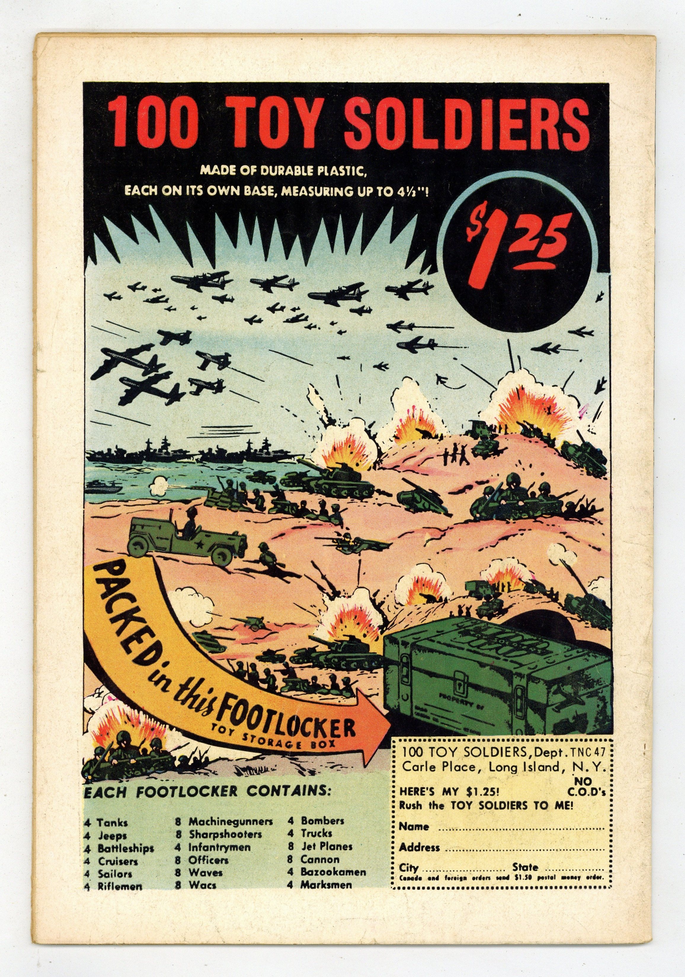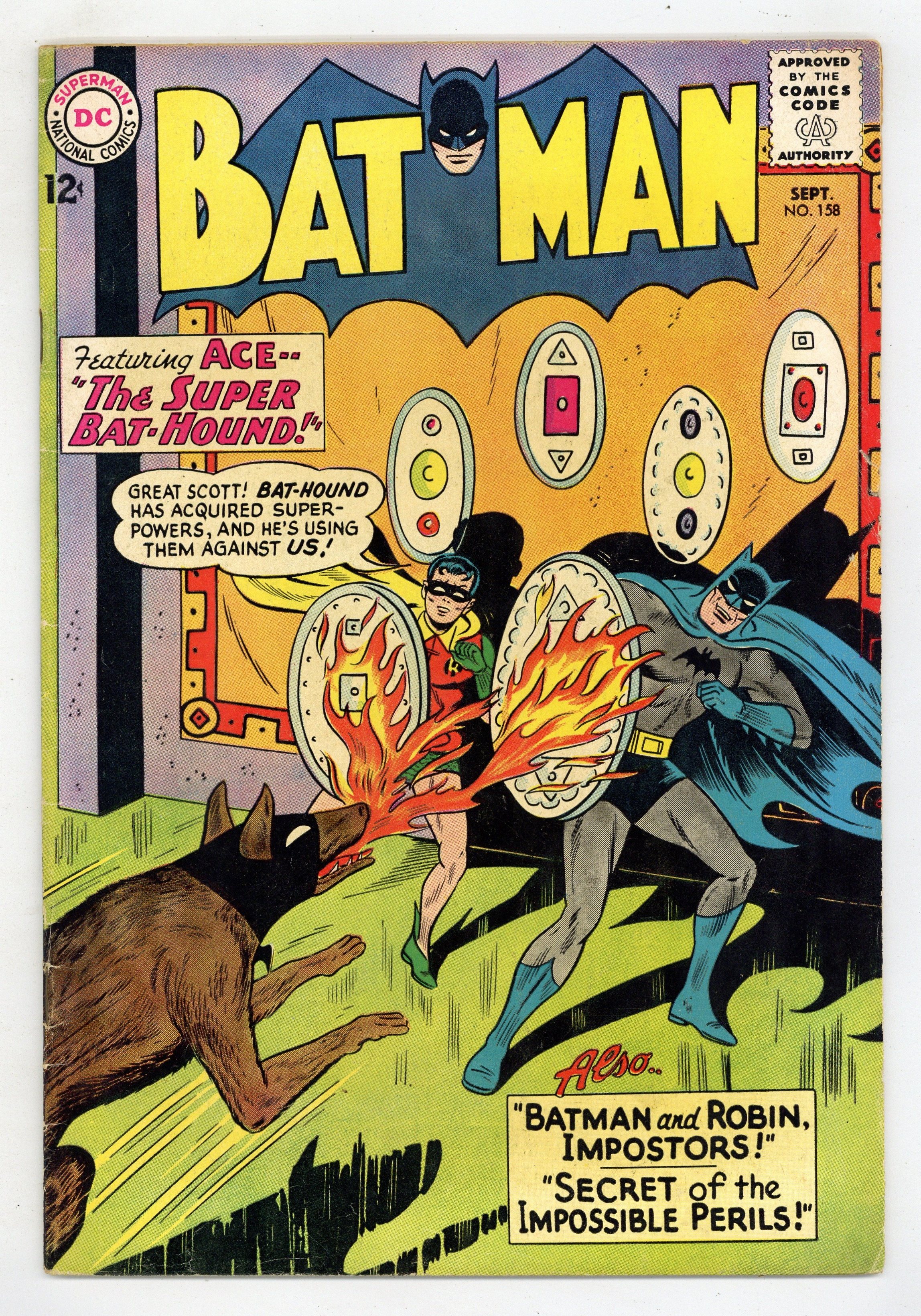 Cover art by Sheldon Moldoff. "Ace - the Super Bat-Hound," script by Dave Wood, pencils by Sheldon Moldoff, inks by Charles Paris; Bat-Mite shows up again to have some fun and decides to give Ace some super powers, which he uses to aid the Caped Crusaders; However, when Ace chases crooks into a cave, the mine fumes cause havoc with the dog's super powers, and he turns on the Dynamic Duo. Half-page Warden Willis story by Henry Boltinoff. "The Secret of the Impossible Perils," script by Bill Finger, pencils by Sheldon Moldoff, inks by Charles Paris; Matt Carter returns from a jungle expedition and, although racked with fever, recounts stories of giant animals that he found including a dinosaur. "Batman and Robin—Imposters," script by Dave Wood, pencils by Sheldon Moldoff, inks by Charles Paris; The Caped Crusaders must deal with some criminals who are posing as them in public, and are getting away with it because the Batman impersonator actually has one of Batman's authentic utility belts that he stole. 36 Pages, Full Color. Cover price $0.12. Grade: VG 4.0 explanation of grade Condition: Used (collectible)