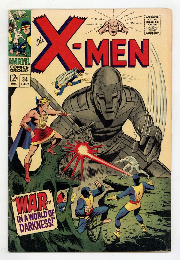 Cover art by Dan Adkins. War -- In a World of Darkness!, script by Roy Thomas, art by Dan Adkins; Ted Roberts warns Jean that her brother has been captured; Angel and Iceman help her find him; Mole Man attacks the X-Men. House ad for Not Brand Echh #1. Ad for the Merry Marvel Marching Society. Letter from artist Peter von Sholly. 36 pgs. $0.12. Cover price $0.12. Grade: FN- 5.5 explanation of grade Condition: Used (collectible)