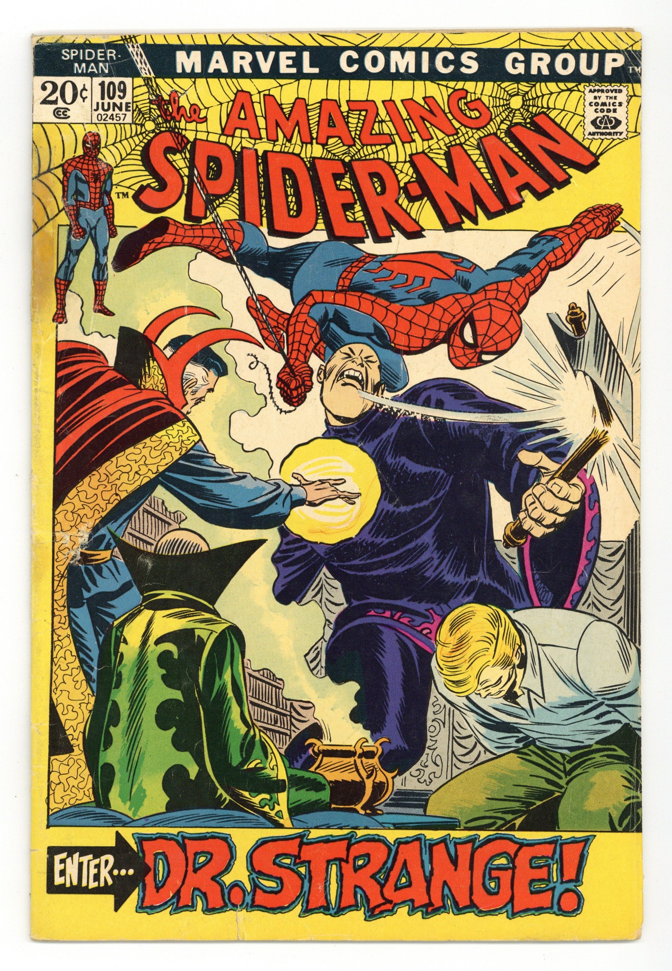 "Enter: Dr. Strange!" Part 2 of 2. Guest-starring Doctor Strange. Script by Stan Lee. Pencils by John Romita. Inks by John Romita and Tony Mortellaro (backgrounds). Cover by John Romita. The web-slinger frantically swings through the city trying to pick up a signal from his spider tracer! The amazing one tossed the tracer on the tall man who abducted Flash last issue. So, find the tracer...find Flash! But instead, Spider-Man picks up a message from the Master of the Mystic Arts! Somehow Dr. Strange knows were Flash has been taken. The duo rushes to the location, and the battle to rescue Flash begins! Cameo appearances by Gwen Stacy, Harry Osborn, Aunt May, and Sha Shan. (Notes: Spider-Man and Dr. Strange meet again in Marvel Team-Up #21. This story was reprinted in Marvel Tales #88.) 36 pages. Cover price $0.20. Grade: GD+ 2.5 explanation of grade Condition: Used (collectible)