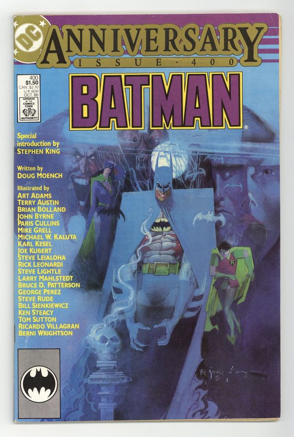 Newsstand Edition. 2-page introduction by Stephen King. As Batman ponders the note 'Know Your Foes' sent to him as a warning, all of his foes are sprung from Arkham Asylum in "Resurrection Night!" Script by Doug Moench. Art by John Byrne (1 page), Steve Lightle & Bruce D. Patterson (6 pages), George Perez (4 pages), Paris Cullins & Larry Mahlstedt (3 pages), Bill Sienkiewicz (7 pages), Arthur Adams & Terry Austin (8 pages), Tom Sutton & Ricardo Villagran (6 pages), Steve Leialoha (3 pages), Joe Kubert (4 pages), Ken Steacy (3 pages), Rick Leonardi & Karl Kesel (6 pages), Brian Bolland (9 pages). Plus: pin-ups by Mike Grell, Michael W. Kaluta, Bernie Wrightson, Steve Rude. Cover by Bill Sienkiewicz. 68 Pages, Full Color. Cover price $1.50. Grade: FN- 5.5 explanation of grade Condition: Used (collectible)
