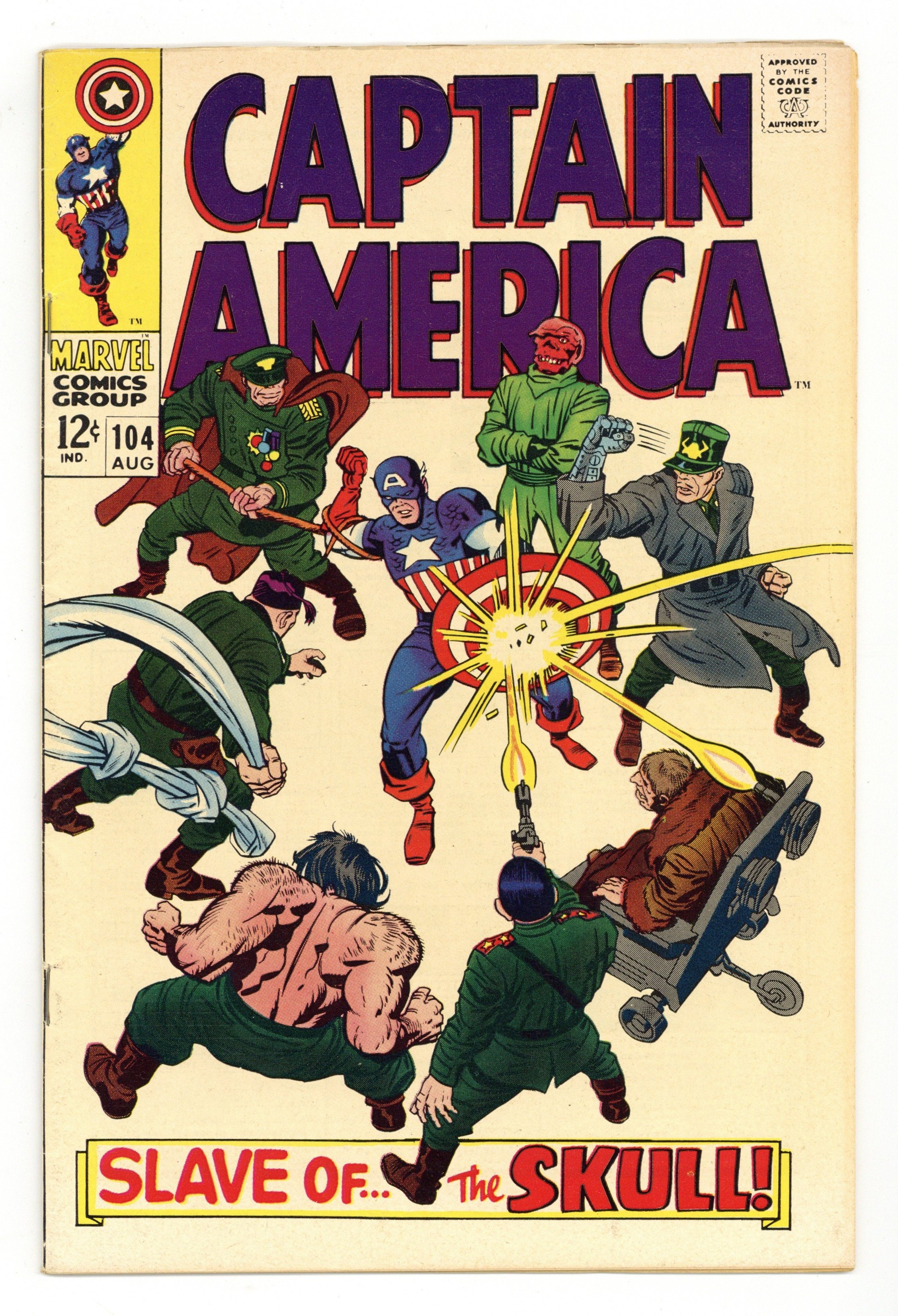 Cover pencils by Jack Kirby, inks by Dan Adkins. "Slave of the Skull!", script by Stan Lee, pencils by Jack Kirby, inks by Dan Adkins and Jim Steranko (p. 11); Shield asks Captain America to test their Life Model Decoys; After Cap easily defeats them, Nick Fury sends them back to the lab; Cap goes to Shields doctor for help with headaches; Red Skull tells Shield he has placed nuclear tape on the back of Captain America's neck; He warns that anyone who tries to remove the special tape would activate the timer on a bomb planted in Washington D.C. by one of the Skull's spies. 36 pgs., full color. $0.12. Cover price $0.12. Grade: FN 6.0 explanation of grade Condition: Used (collectible)