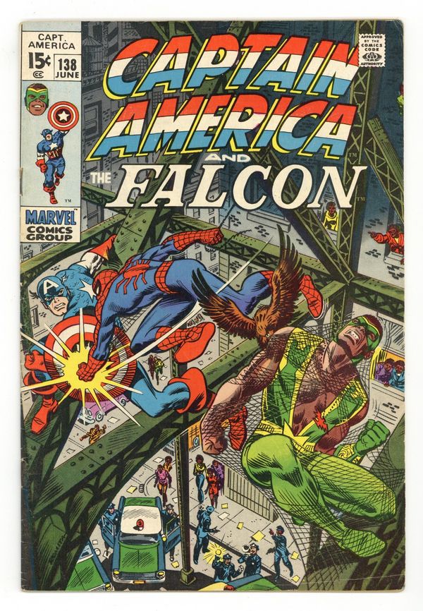 Cover by John Romita. "It Happens In Harlem," script by Stan Lee, pencils by John Romita, inks by John Romita and Tony Mortellaro; Captain America leaves the Falcon, who Cap thinks is hiding something from him; Stone Faces minions attack Falcon and drive off with him; Spidey searches for the Falcon, who has a Spider-Tracer on him; Spidey follows the Falcon in Stone Faces limo to the gang lords hideout; Falcon attacks Spidey, who webs him to a bridge; Cap faces Spider-Man, but they along with Falcon resolve matters and go back to Stone Faces lair; Our heroes foil Stone Face's plans for Glory Grants building. 36 pgs., full color. $0.15. Cover price $0.15. Grade: VG/FN 5.0 explanation of grade Condition: Used (collectible)