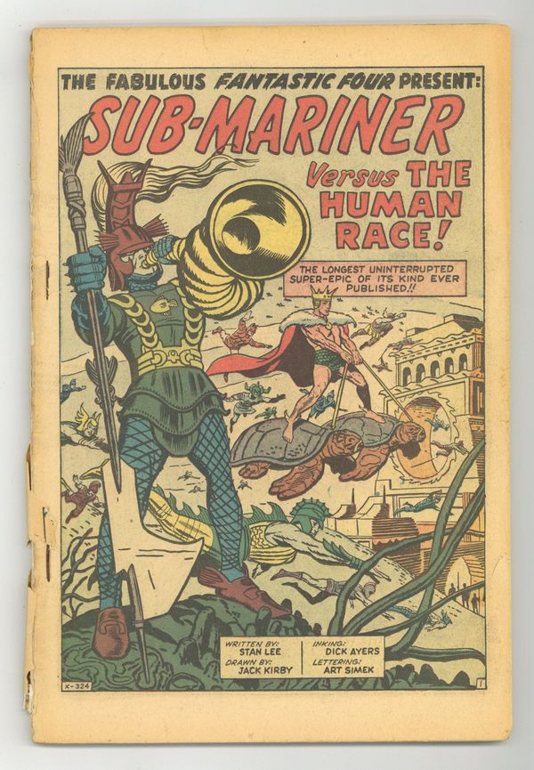 New Sub-Mariner/FF story: "Sub-Mariner Versus the Human Race!" Script by Stan Lee; pencils by Jack Kirby; inks by Dick Ayers. New Spider-Man/FF story: "The Fabulous Fantastic Four Meet Spider-Man!" Script by Stan Lee; pencils by Kirby; inks by Steve Ditko. Fourteen pages new pin-ups and special features by Kirby/Sol Brodsky. Thirteen-page Fantastic Four origin reprinted from FF #1 76 pgs. Cover price $0.25. Grade: Coverless explanation of grade Condition: Used (collectible)