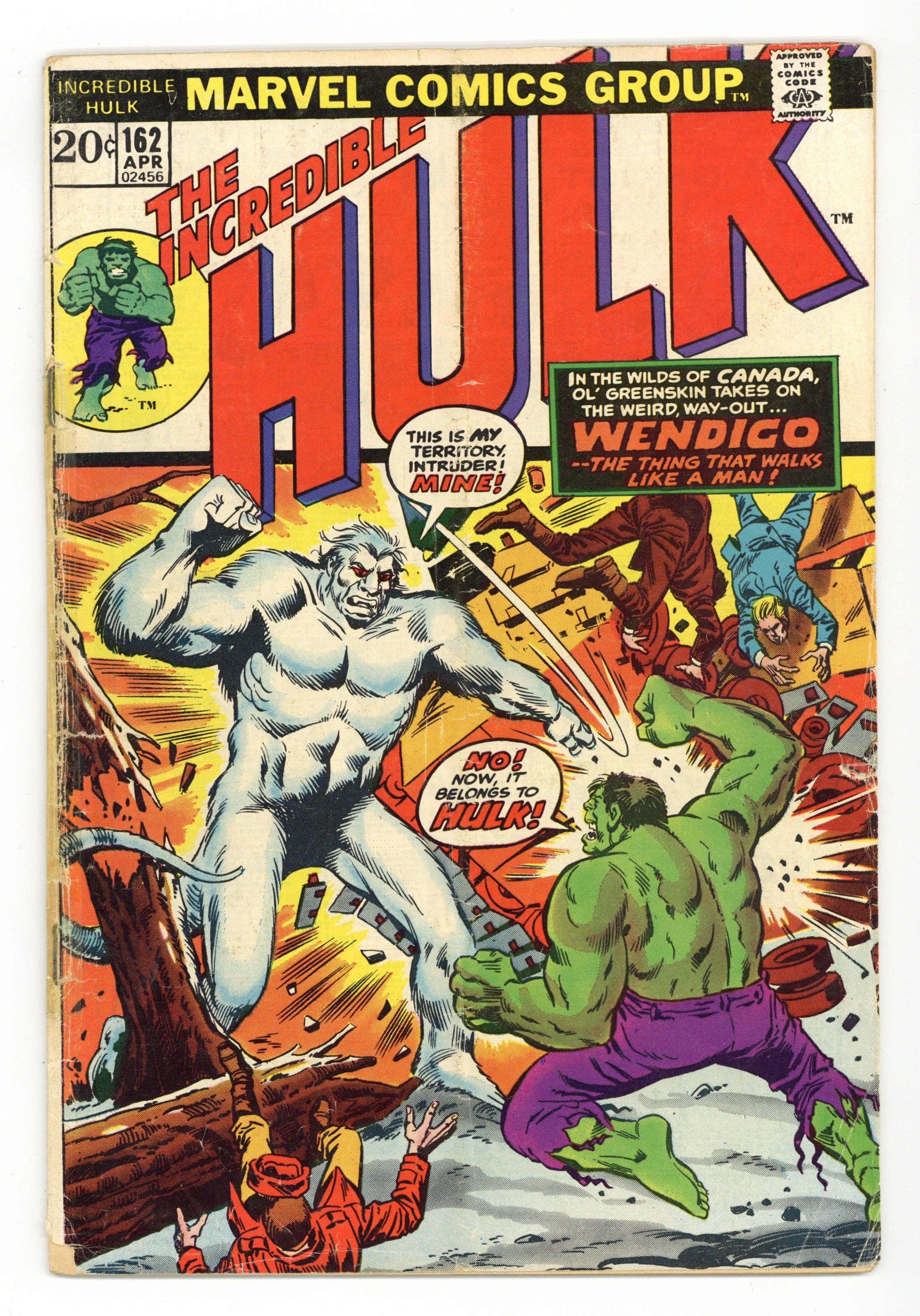 Cover pencils by Herb Trimpe, inks by Sal Trapani. Spawn of the Flesh-Eater!, script by Steve Englehart, pencils by Herb Trimpe, inks by Sal Trapani; Hulk is lost in the Canadian woods when he runs across a distressed young woman who is looking for her missing brother; Hulk rescues a man from the Wendigo whom he thinks to be her brother but Marie tells him that it is her brother's friend, Georges; When Georges regains consciousness, he tells a chilling tale of an act of cannibalism that turned Paul Cartier into the Wendigo. 36 pgs. $0.20. Cover price $0.20. Grade: GD- 1.8 explanation of grade Condition: Used (collectible)