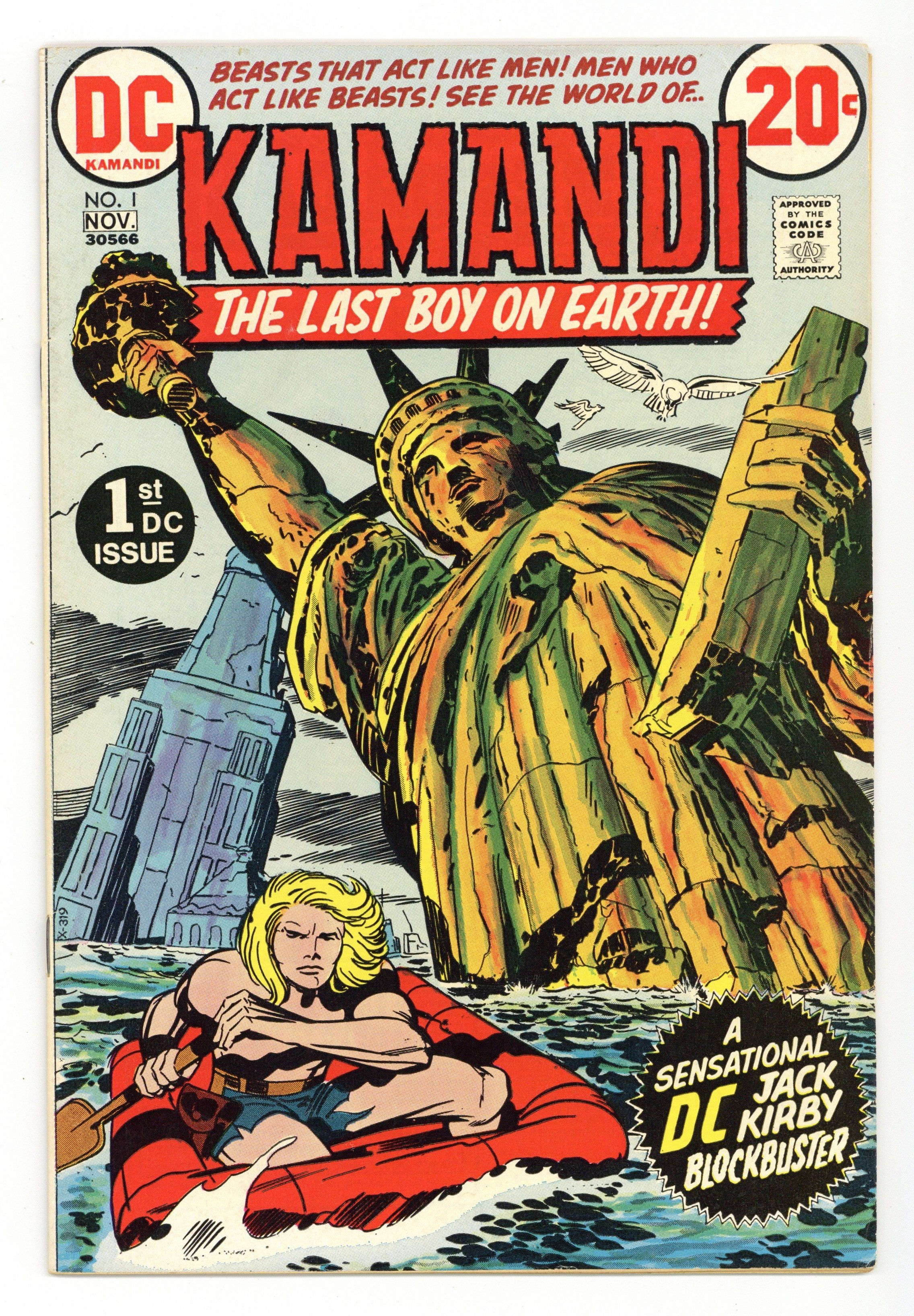 1st appearance and origin of Kamandi. "The Last Boy on Earth." Script and pencils by Jack Kirby, inks by Mike Royer. Cover by Kirby and Royer. A series that borrows many concepts from Planet of the Apes, Kamandi takes place in an alternate future where animals have mutated into bipedal beings of intelligence and where humans are treated like savage beasts. Kamandi avenges the death of his grandfather, who was killed by wolves, but is then captured by a tiger named Caesar, who turns him over to dog-scientist Dr. Canus. Canus proceeds to help Kamandi, and this is where the so-called last boy on earth hooks up with Ben Boxer, a mutated human who can turn to living metal. Cover price $0.20. Grade: VG+ 4.5 explanation of grade Condition: Used (collectible)