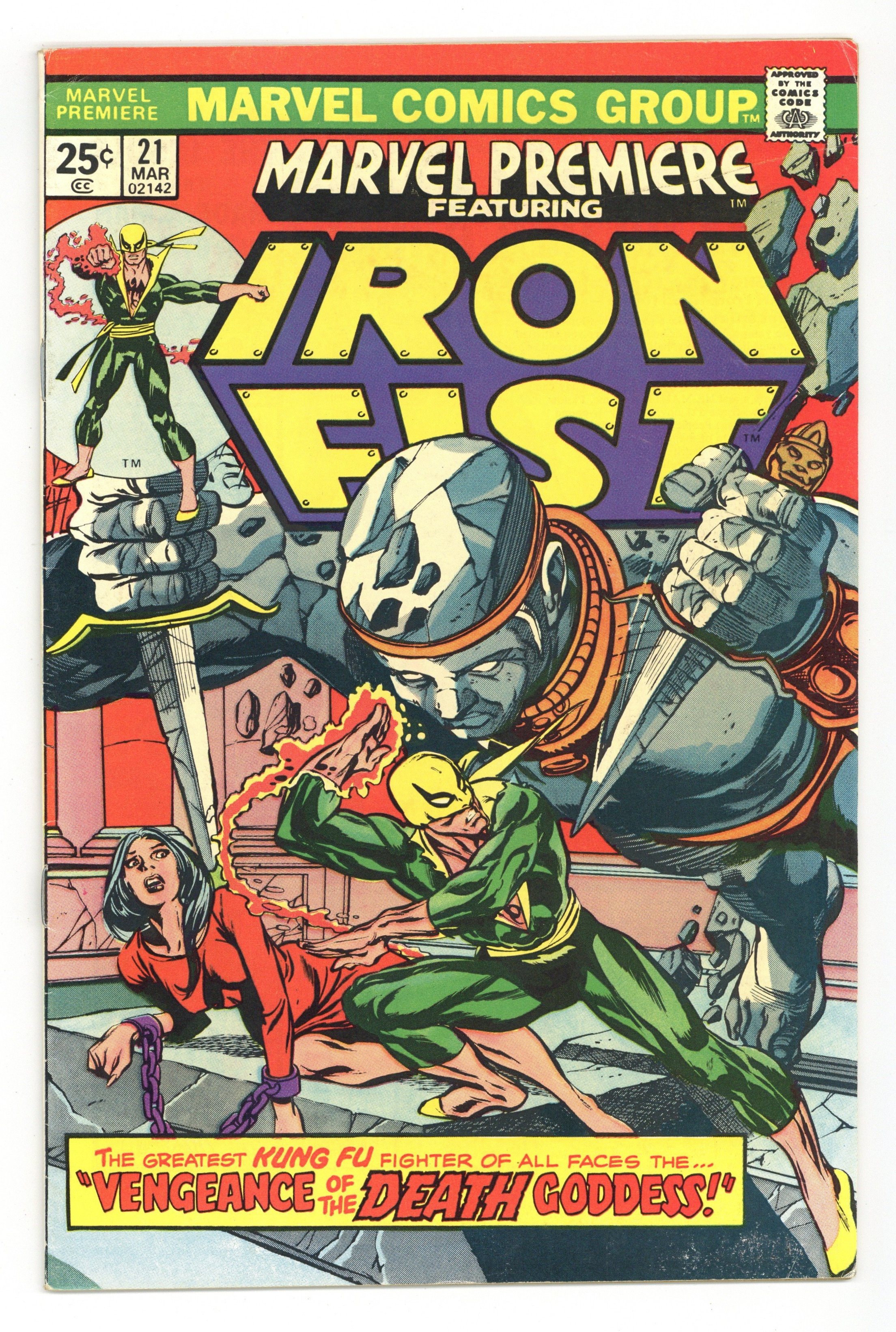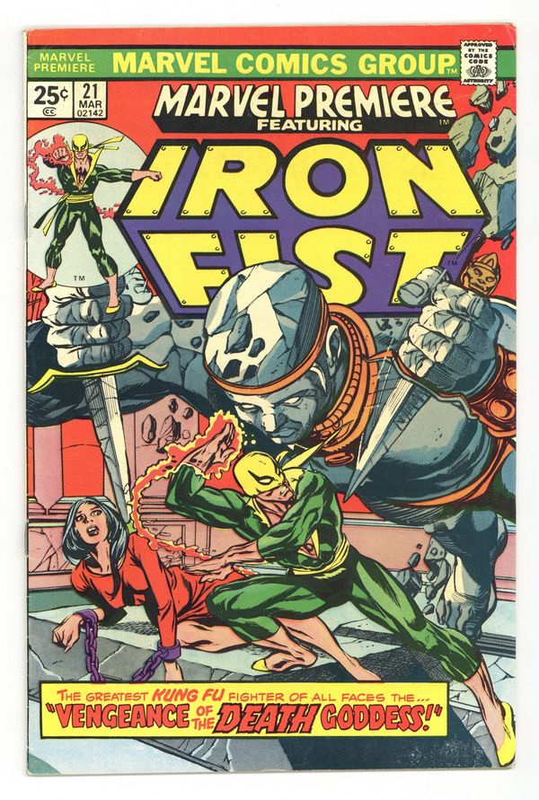 Cover pencils by Gil Kane, inks by Tom Palmer. Daughters of the Death-Goddess, script by Tony Isabella, pencils by Arvell Jones, inks by Vince Colletta; Batroc becomes enraged when the Meachums refuse to pay him for failing to kill Iron Fist; Iron Fist arrives at the Wings to find dead cult members lying in rubble but no sign of his friends; Misty Knight arrives and attacks Danny whom she suspects has done something with Colleen; Iron Fist follows the Ninja to the underground Temple of Kali where he finds Lee and Colleen in chains; He battles the daughters of Kali, but the Sacred Volume of Kali is burned up in the conflict; This enrages the Ninja who splits off from Lee Wing whom he has been possessing and prepares to kill Iron Fist; Brief appearance by Batroc. 36 pgs. $0.25. Cover price $0.25. Grade: VG/FN 5.0 explanation of grade Condition: Used (collectible)