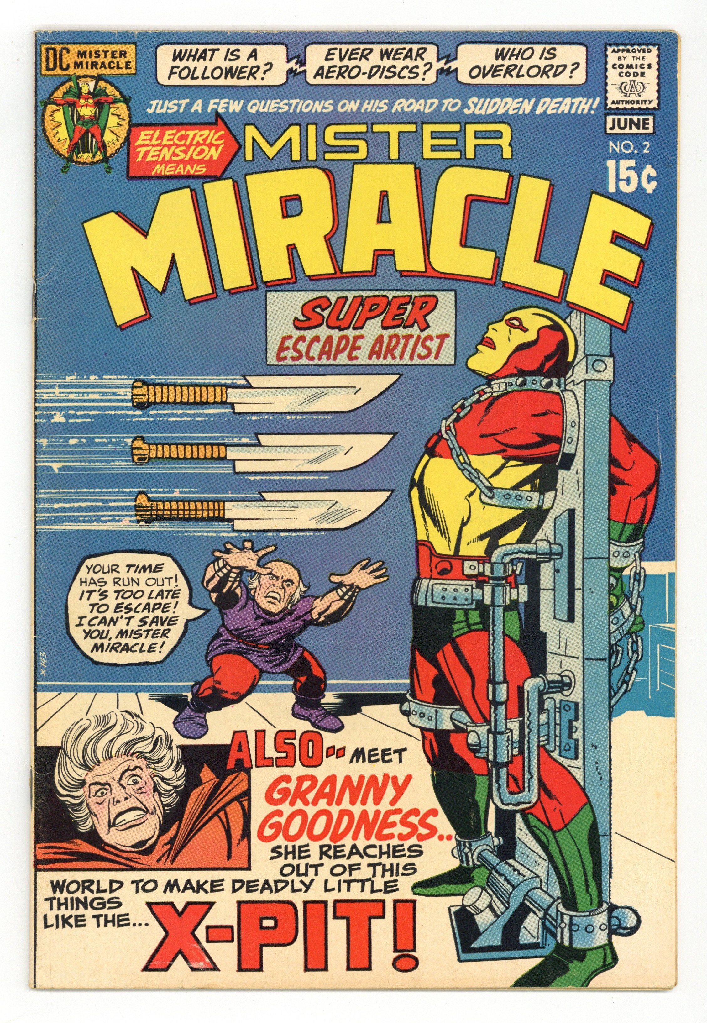 "X-Pit!" This action-packed issue finds Mister Miracle battling Overlord and escaping one trap after another. Features the introduction of Granny Goodness. Script, pencils, and cover by Jack Kirby. Inks by Vince Colletta. Cover price $0.15. Grade: FN- 5.5 explanation of grade Condition: Used (collectible)