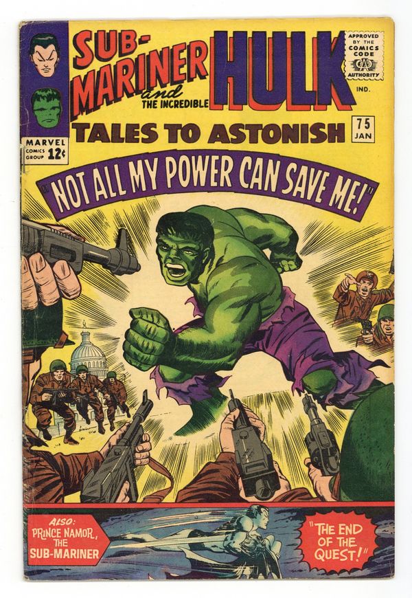 Cover by Jack Kirby, Gene Colan, Sol Brodsky, and Vince Colletta. The End of the Quest!, script by Stan Lee, art by Gene Colan (as Adam Austin) and Vince Colletta; Prince Namor returns to Atlantis to save Dorma and battle Krang. Not All My Power Can Save Me!, script by Stan Lee, art by Jack Kirby and Mike Esposito (as Mickey Demeo); With the Leader dead, the Hulk uses the Watcher's ultimate machine on himself and its only effect is to let him know that Rick has once again been captured by the miltary so they can learn the connection between Bruce Banner and the Hulk; Leaping to the rescue, Hulk is zapped by the t-gun which propels him into the future. 36 pgs., full color. $0.12. Cover price $0.12. Grade: VG 4.0 explanation of grade Condition: Used (collectible)