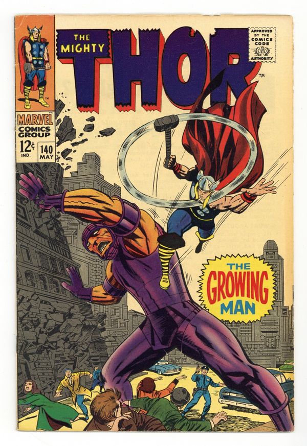 Cover pencils by Jack Kirby, inks by Vince Colletta. First appearance of the Growing Man in "The Growing Man!", script by Stan Lee, pencils by Jack Kirby, inks by Vince Colletta; After winning the battle against the Trolls last issue, the Asgardians are celebrating their victory; Thor tells Odin that he had spent too much time away from Earth and that he wants to come back; Meanwhile, a museum expedition had discovered a small doll that had grown to the size of a human; Thor is called to help the cops in defeating this Growing Man, and he discovers that the Growing Man's master is actually Kang. Appearances by Sif, Odin, and Kang the Conqueror. Tales of Asgard: "The Battle Begins!", script by Stan Lee, pencils by Jack Kirby, inks by Vince Colletta; Thor and companions defeat the Jinni Devil. 36 pgs., full color. $0.12. Cover price $0.12. Grade: VG/FN 5.0 explanation of grade Condition: Used (collectible)